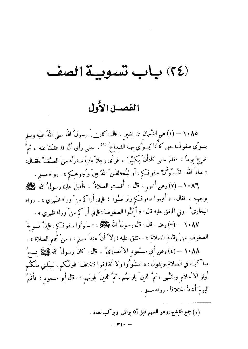 عَن النُّعْمَانِ بْنِ بَشِيرٍ قَالَ: كَانَ رَسُولُ اللَّهِ صَلَّى اللَّهُ عَلَيْهِ وَسَلَّمَ يُسَوِّي صُفُوفَنَا حَتَّى كَأَنَّمَا يُسَوِّي بِهَا الْقِدَاحَ حَتَّى رَأَى أَنَّا قَدْ عَقَلْنَا عَنْهُ ثُمَّ خَرَجَ يَوْمًا فَقَامَ حَتَّى كَادَ أَنْ يُكَبِّرَ فَرَأَى رَجُلًا بَادِيًا صَدْرُهُ مِنَ الصَّفِّ فَقَالَ: «عِبَادَ اللَّهِ لَتُسَوُّنَّ صُفُوفَكُمْ أَوْ لَيُخَالِفَنَّ اللَّهُ بَيْنَ وُجُوهِكُمْ» . رَوَاهُ مُسلم