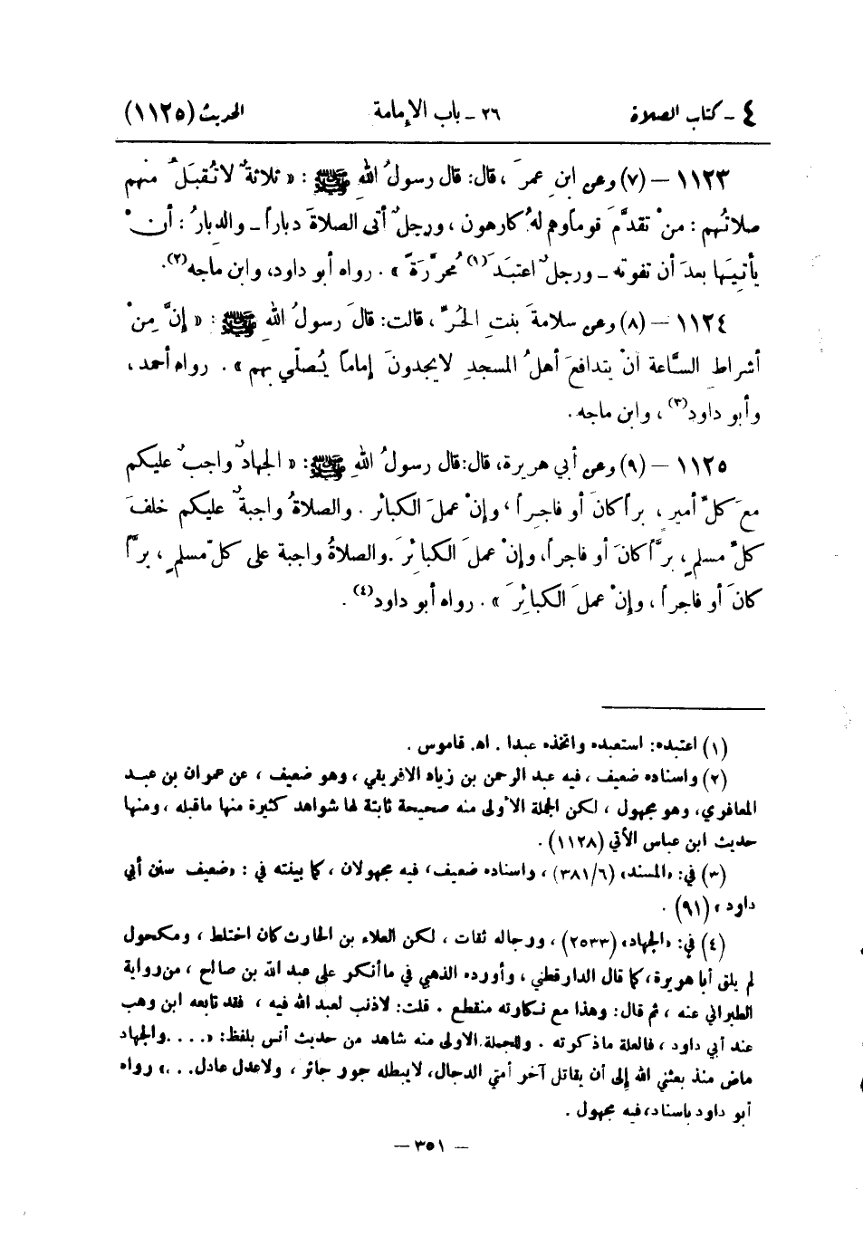 وَعَنْ أَبِي هُرَيْرَةَ قَالَ: قَالَ رَسُولُ اللَّهِ صلى الله عَلَيْهِ وَسلم: «الْجِهَادُ وَاجِبٌ عَلَيْكُمْ مَعَ كُلِّ أَمِيرٍ بَرًّا كَانَ أَوْ فَاجِرًا وَإِنْ عَمِلَ الْكَبَائِرَ. وَالصَّلَاةٌ وَاجِبَةٌ عَلَيْكُمْ خَلْفَ كُلِّ مُسْلِمٍ بَرًّا كَانَ أَوْ فَاجِرًا وَإِنْ عَمِلَ الْكَبَائِرَ. وَالصَّلَاةٌ وَاجِبَةٌ عَلَى كُلِّ مُسْلِمٍ بَرًّا كَانَ أَوْ فَاجِرًا وَإِنْ عَمِلَ الْكَبَائِرَ» . رَوَاهُ أَبُو دَاوُد