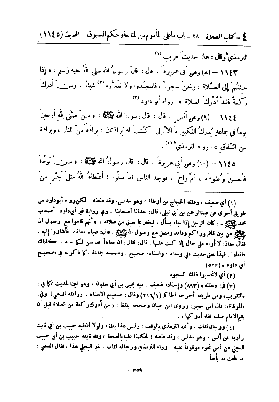 وَعَنْ أَبِي هُرَيْرَةَ رَضِيَ اللَّهُ عَنْهُ قَالَ: قَالَ رَسُولُ اللَّهِ صَلَّى اللَّهُ عَلَيْهِ وَسَلَّمَ: «مَنْ تَوَضَّأَ فَأَحْسَنَ وُضُوءَهُ ثُمَّ رَاحَ فَوَجَدَ النَّاسَ قَدْ صَلَّوْا أَعْطَاهُ اللَّهُ مِثْلَ أَجْرِ مَنْ -[360]- صَلَّاهَا وَحَضَرَهَا لَا يَنْقُصُ ذَلِكَ م أُجُورهم شَيْئا» . رَوَاهُ أَبُو دَاوُد وَالنَّسَائِيّ