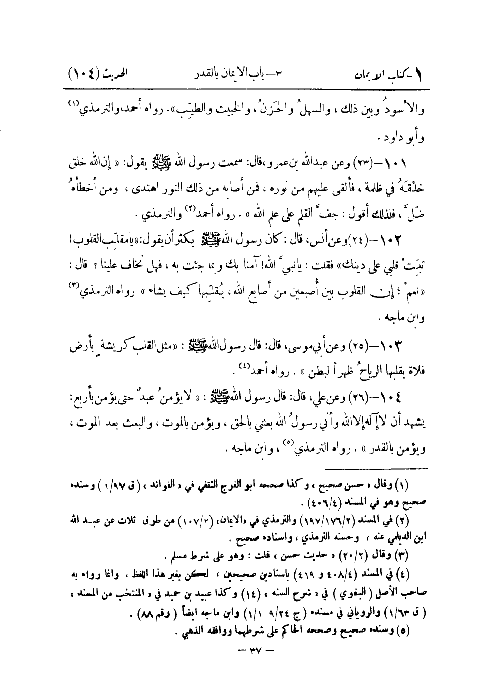 وَعَنْ عَبْدِ اللَّهِ بْنِ عَمْرٌو قَالَ: سَمِعْتُ رَسُولَ اللَّهِ صَلَّى اللَّهُ عَلَيْهِ وَسَلَّمَ يَقُولُ: " إِنَّ اللَّهَ خَلَقَ خَلْقَهُ فِي ظُلْمَةٍ فَأَلْقَى عَلَيْهِمْ مِنْ نُورِهِ فَمَنْ أَصَابَهُ مِنْ ذَلِكَ النُّورِ اهْتَدَى وَمَنْ أَخْطَأَهُ ضَلَّ فَلذَلِك أَقُول: جف الْقلب على علم الله ". رَوَاهُ أَحْمد وَالتِّرْمِذِيّ