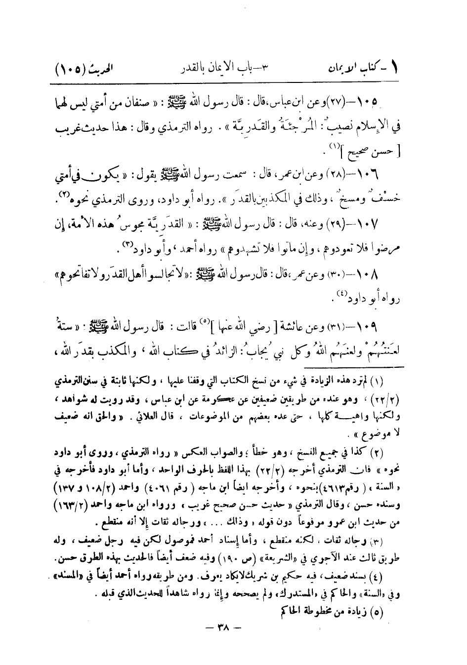 وَعَنِ ابْنِ عُمَرَ قَالَ: قَالَ رَسُولُ اللَّهِ صَلَّى اللَّهُ عَلَيْهِ وَسَلَّمَ: «الْقَدَرِيَّةُ مَجُوسُ هَذِهِ الْأُمَّةِ إِنْ مَرِضُوا فَلَا تَعُودُوهُمْ وَإِنْ مَاتُوا فَلَا تشهدوهم» . رَوَاهُ أَحْمد وَأَبُو دَاوُد