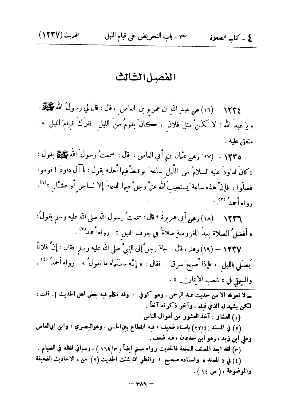 عَنْ عَبْدِ اللَّهِ بْنِ عَمْرِو بْنِ الْعَاصِ قَالَ: قَالَ لِي رَسُولُ اللَّهِ صَلَّى اللَّهُ عَلَيْهِ وَسَلَّمَ: «يَا عَبْدَ اللَّهِ لَا تَكُنْ مِثْلَ فُلَانٍ كَانَ يَقُومُ مِنَ اللَّيْلِ فَتَرَكَ قيام اللَّيْل»