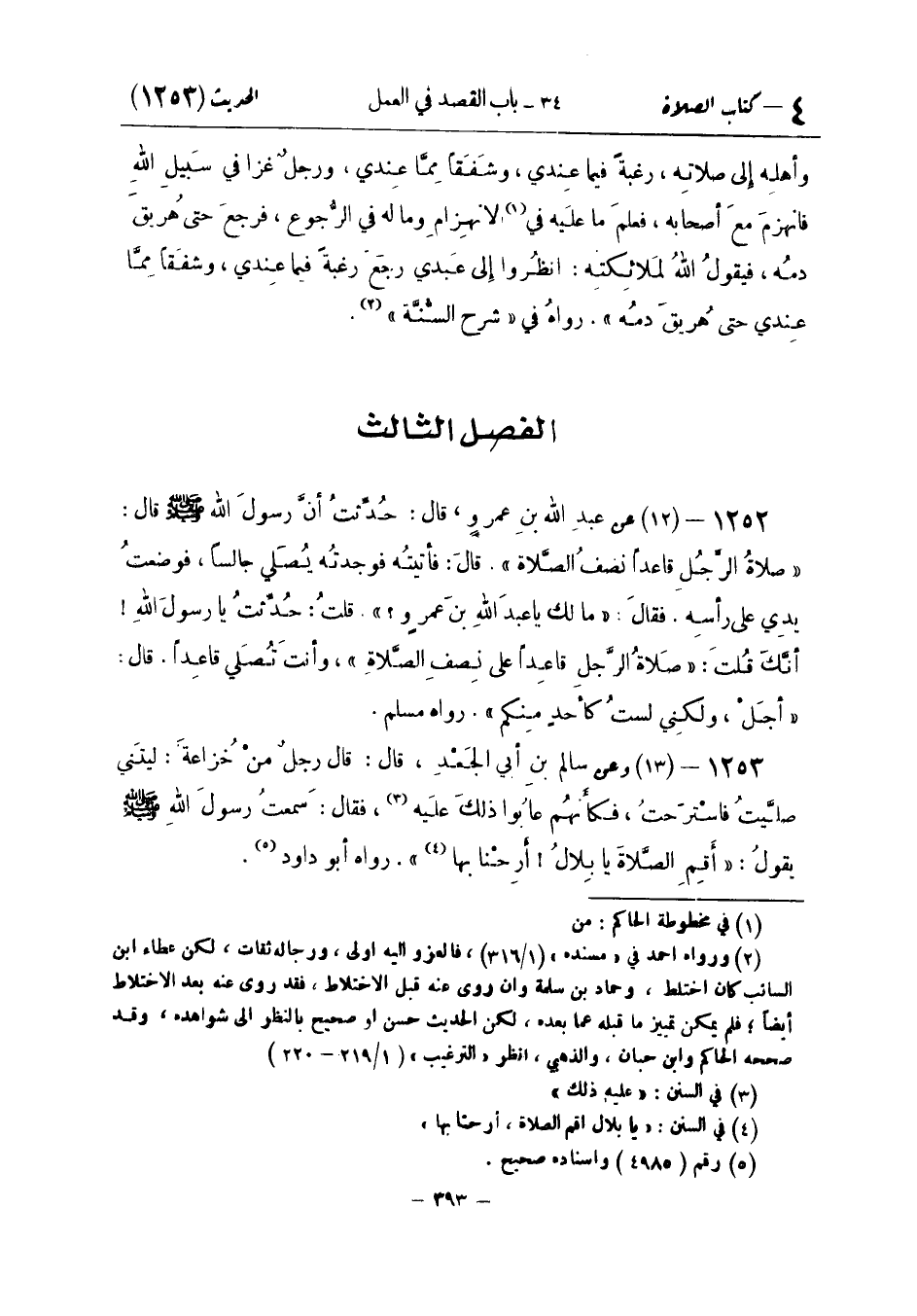 عَنْ عَبْدِ اللَّهِ بْنِ عَمْرٍو قَالَ: حُدِّثْتُ أَنَّ رَسُولَ اللَّهِ صَلَّى اللَّهُ عَلَيْهِ وَسَلَّمَ قَالَ: «صَلَاةُ الرَّجُلِ قَاعِدًا نِصْفُ الصَّلَاةِ» قَالَ: فَأَتَيْتُهُ فَوَجَدْتُهُ يُصَلِّي جَالِسًا فَوَضَعْتُ يَدِي عَلَى رَأسه فَقَالَ: «مَالك يَا عَبْدَ اللَّهِ بْنَ عَمْرٍو؟» قُلْتُ: حُدِّثْتُ يَا رَسُولَ اللَّهِ أَنَّكَ قُلْتَ: «صَلَاةُ الرَّجُلِ قَاعِدًا عَلَى نِصْفِ الصَّلَاةِ» وَأَنْتَ تُصَلِّي قَاعِدًا قَالَ: «أَجَلْ وَلَكِنِّي لَسْتُ كَأَحَدٍ مِنْكُمْ» . رَوَاهُ مُسلم