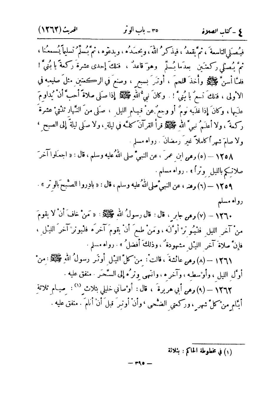 وَعَنْ جَابِرٍ قَالَ: قَالَ رَسُولُ اللَّهِ صَلَّى اللَّهُ عَلَيْهِ وَسَلَّمَ: «مَنْ خَافَ أَنْ لَا يَقُومَ مِنْ آخِرِ اللَّيْلِ فَلْيُوتِرْ أَوَّلَهُ وَمَنْ طَمِعَ أَنْ يَقُومَ آخِرَهُ فَلْيُوتِرْ آخِرَ اللَّيْلِ فَإِنَّ صَلَاةَ آخِرِ اللَّيْلِ مَشْهُودَةٌ وَذَلِكَ أَفْضَلُ» . رَوَاهُ مُسلم