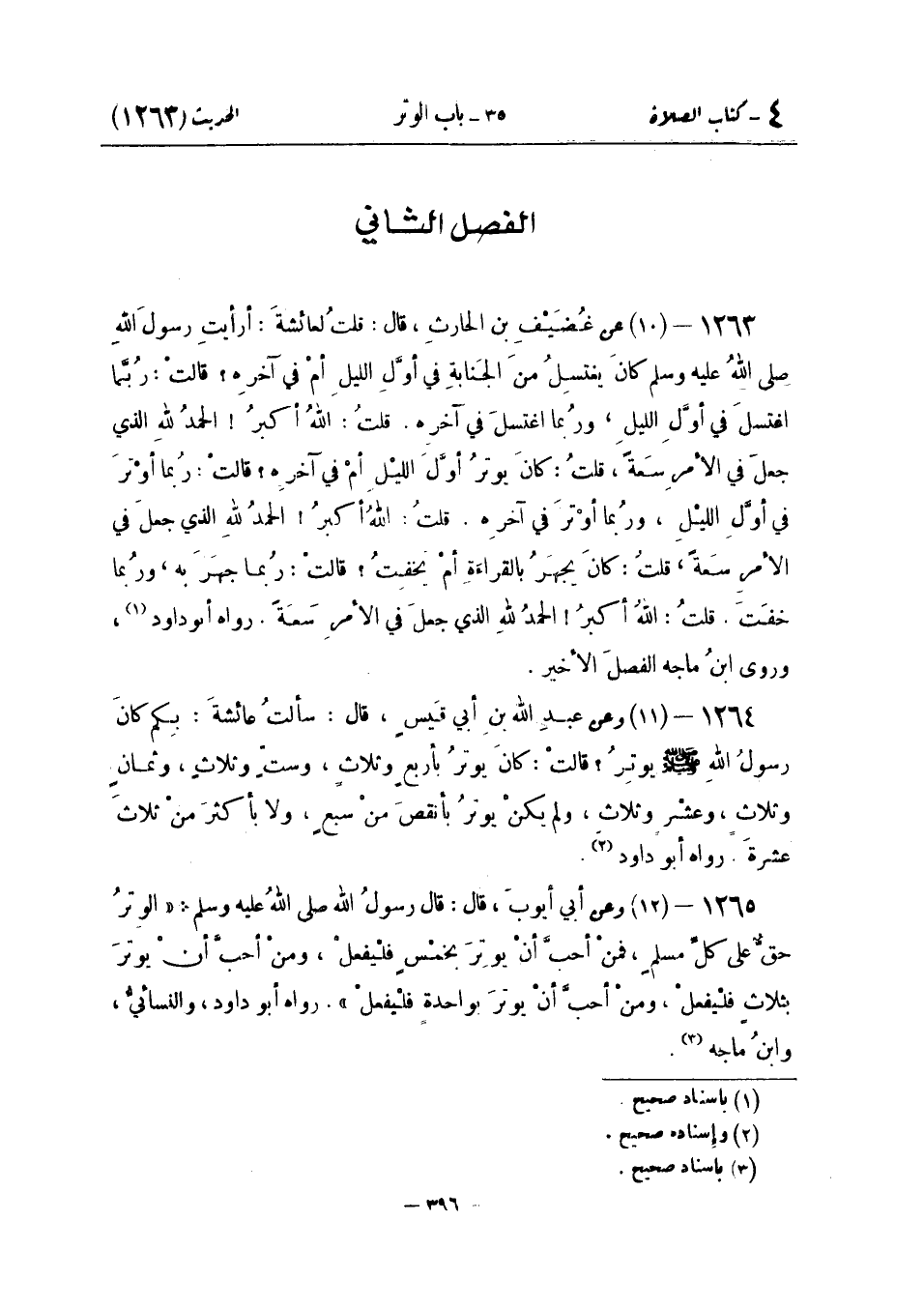 عَن غُضَيْف بن الْحَارِث قَالَ: قُلْتُ لِعَائِشَةَ: أَرَأَيْتِ رَسُولَ اللَّهِ صَلَّى اللَّهُ عَلَيْهِ وَسَلَّمَ كَانَ يَغْتَسِلُ مِنَ الْجَنَابَةِ فِي أَوَّلِ اللَّيْلِ أَمْ فِي آخِرِهِ؟ قَالَتْ: رُبَّمَا اغْتَسَلَ فِي أَوَّلِ اللَّيْلِ وَرُبَّمَا اغْتَسَلَ فِي آخِرِهِ قُلْتُ: اللَّهُ أَكْبَرُ الْحَمْدُ لِلَّهِ الَّذِي جَعَلَ فِي الْأَمْرِ سَعَةً قُلْتُ: كَانَ يُوتِرُ أَوَّلَ اللَّيْلِ أَمْ فِي آخِرِهِ؟ قَالَتْ: رُبَّمَا أَوْتَرَ فِي أَوَّلِ اللَّيْلِ وَرُبَّمَا أَوْتَرَ فِي آخِرِهِ قُلْتُ: اللَّهُ أَكْبَرُ الْحَمْدُ لِلَّهِ الَّذِي جَعَلَ فِي الْأَمْرِ سَعَةً قُلْتُ: كَانَ يَجْهَرُ بِالْقِرَاءَةِ أَمْ يَخْفُتُ؟ قَالَتْ: رُبَّمَا جَهَرَ بِهِ وَرُبَّمَا خَفَتَ قُلْتُ: اللَّهُ أَكْبَرُ الْحَمْدُ لِلَّهِ الَّذِي جَعَلَ فِي الْأَمْرِ سَعَةً. رَوَاهُ أَبُو دَاوُدَ وَرَوَى ابْنُ مَاجَهْ الْفَصْلَ الْأَخِيرَ
