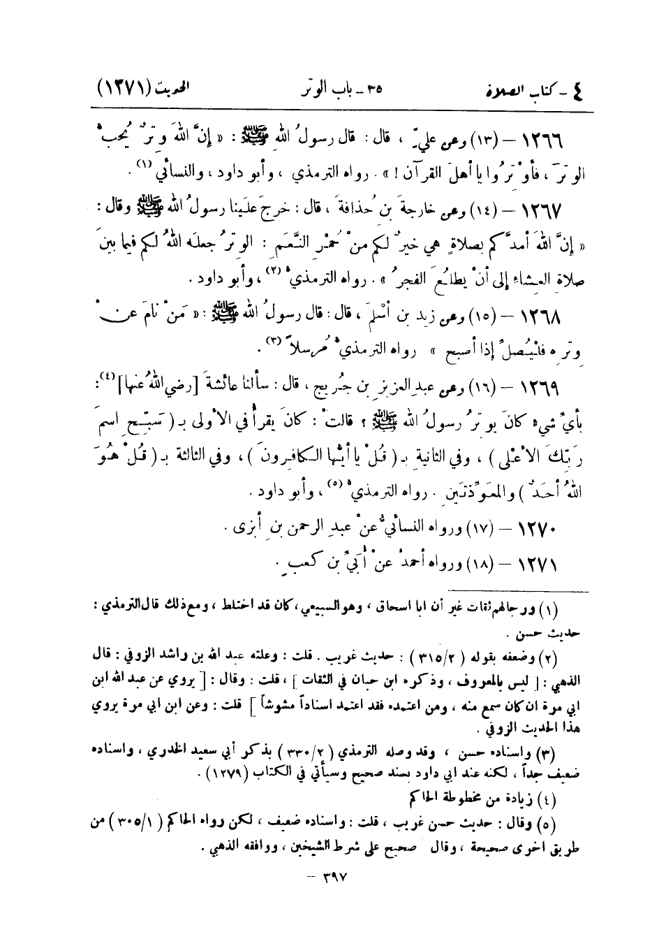 وَعَنْ عَلِيٍّ قَالَ: قَالَ رَسُولُ اللَّهِ صَلَّى اللَّهُ عَلَيْهِ وَسَلَّمَ: «إِنَّ اللَّهَ وَتْرٌ يُحِبُّ الْوَتْرَ فَأَوْتِرُوا يَا أَهْلَ الْقُرْآنِ» . رَوَاهُ التِّرْمِذِيُّ وَأَبُو دَاوُدَ وَالنَّسَائِيّ