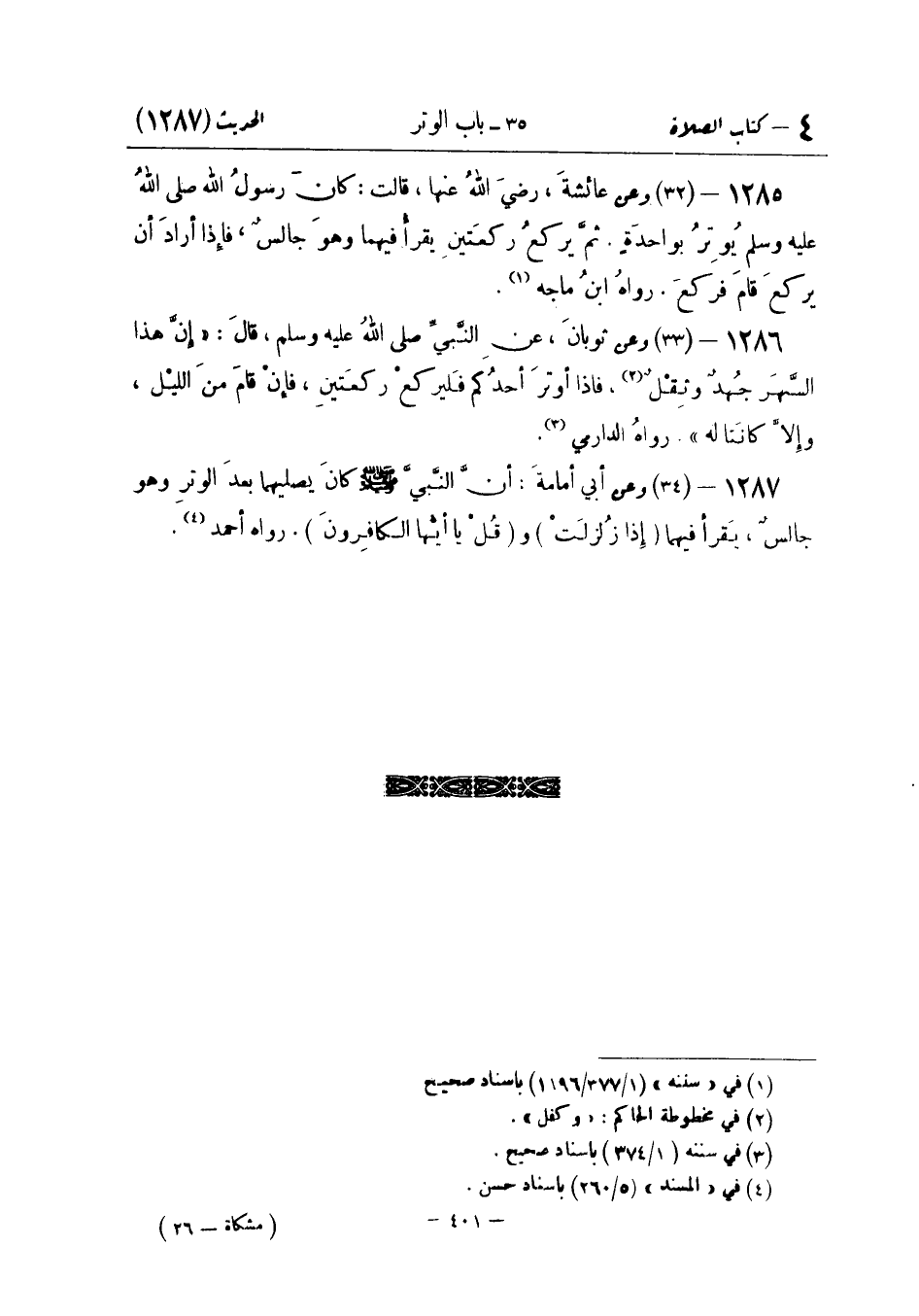 وَعَنْ عَائِشَةَ رَضِيَ اللَّهُ عَنْهَا قَالَتْ: كَانَ رَسُولُ اللَّهِ صَلَّى اللَّهُ عَلَيْهِ وَسَلَّمَ يُوتِرُ بِوَاحِدَةٍ ثُمَّ يَرْكَعُ رَكْعَتَيْنِ يَقْرَأُ فِيهِمَا وَهُوَ جَالِسٌ فَإِذَا أَرَادَ أَنْ يَرْكَعَ قَامَ فَرَكَعَ. رَوَاهُ ابْن مَاجَه