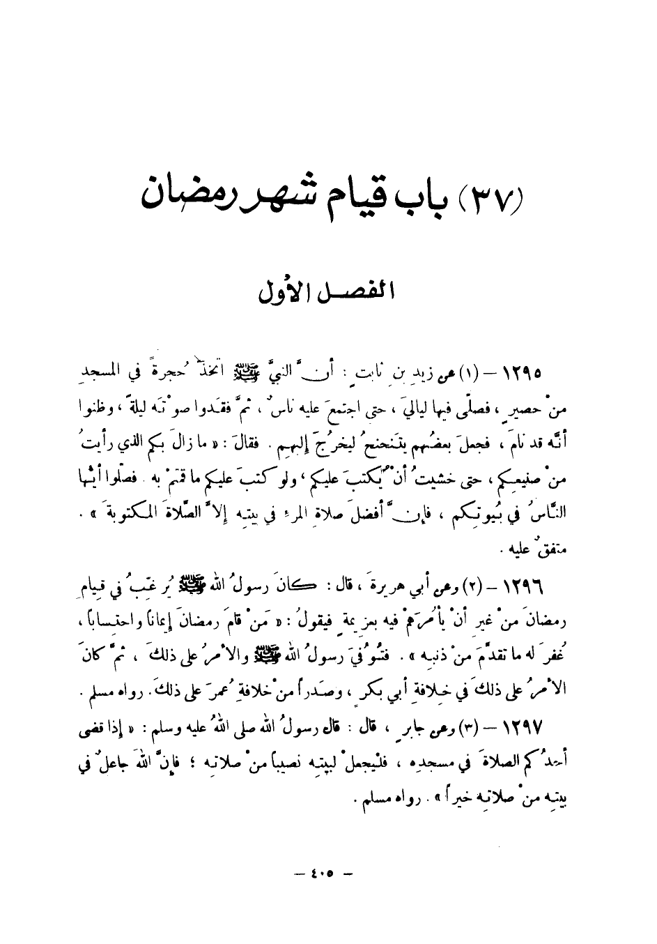 وَعَنْ أَبِي هُرَيْرَةَ رَضِيَ اللَّهُ عَنْهُ قَالَ: (كَانَ رَسُولُ اللَّهِ صَلَّى اللَّهُ عَلَيْهِ وَسَلَّمَ يَرْغَبُ فِي قِيَامِ رَمَضَانَ مِنْ غَيْرِ أَنْ يَأْمُرَهُمْ فِيهِ بِعَزِيمَةٍ فَيَقُولُ: «مَنْ قَامَ رَمَضَانَ إِيمَانًا وَاحْتِسَابًا غُفِرَ لَهُ مَا تَقَدَّمَ مِنْ ذَنْبِهِ. فَتُوُفِّيَ رَسُولُ اللَّهِ صَلَّى اللَّهُ عَلَيْهِ وَسَلَّمَ والمر عَلَى ذَلِكَ ثُمَّ كَانَ الْأَمْرُ عَلَى ذَلِكَ فِي خِلَافَةِ أَبِي بَكْرٍ وَصَدْرًا مِنْ خِلَافَةِ عمر على ذَلِك» . رَوَاهُ مُسلم