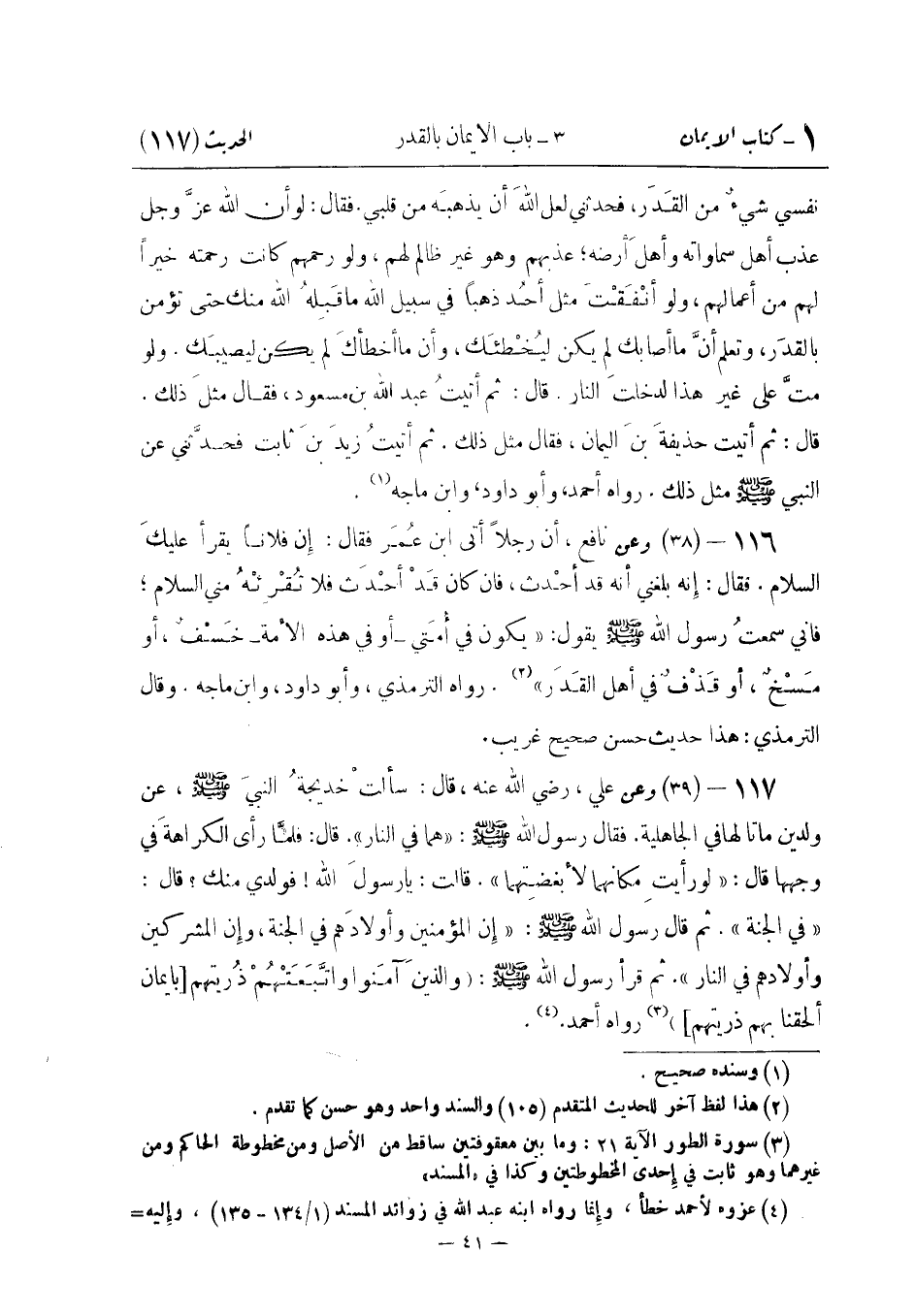 عَن نَافِع أَن ابْن عمر جَاءَهُ رجل فَقَالَ إِنَّ فُلَانًا يَقْرَأُ عَلَيْكَ السَّلَامَ فَقَالَ لَهُ إِنَّهُ بَلَغَنِي أَنَّهُ قَدْ أَحْدَثَ فَإِنْ كَانَ قَدْ أَحْدَثَ فَلَا تُقْرِئْهُ مِنِّي السَّلَامَ فَإِنِّي سَمِعْتُ رَسُولَ اللَّهِ صَلَّى اللَّهُ عَلَيْهِ وَسَلَّمَ يَقُول يكون فِي هَذِه الْأمة أَو فِي أمتِي الشَّك مِنْهُ خَسْفٌ أَوْ مَسْخٌ أَوْ قَذْفٌ فِي أَهْلِ الْقَدَرِ. رَوَاهُ التِّرْمِذِيُّ وَأَبُو دَاوُدَ وَابْنُ مَاجَهْ وَقَالَ التِّرْمِذِيُّ: هَذَا حَدِيثٌ حَسَنٌ صَحِيحٌ غَرِيبٌ