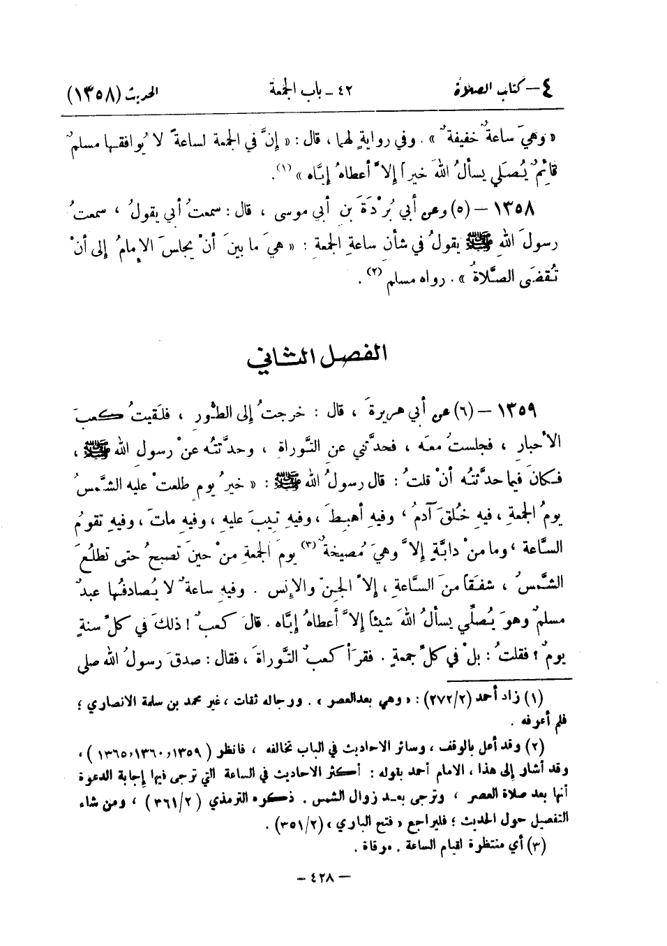 عَنْ أَبِي هُرَيْرَةَ قَالَ: خَرَجْتُ إِلَى الطُّورِ فَلَقِيتُ كَعْبَ الْأَحْبَارِ فَجَلَسْتُ مَعَهُ فَحَدَّثَنِي عَنِ التَّوْرَاةِ وَحَدَّثْتُهُ عَنْ رَسُولِ اللَّهِ صَلَّى اللَّهُ عَلَيْهِ وَسَلَّمَ فَكَانَ فِيمَا حَدَّثْتُهُ أَنْ قُلْتُ: قَالَ رَسُولُ اللَّهِ صَلَّى اللَّهُ عَلَيْهِ وَسَلَّمَ: " خَيْرُ يَوْمٍ طَلَعَتْ عَلَيْهِ الشَّمْسُ يَوْمُ الْجُمُعَةِ فِيهِ خُلِقَ آدَمُ وَفِيهِ أُهْبِطَ وَفَيْهِ تِيبَ عَلَيْهِ وَفِيهِ مَاتَ وَفِيهِ تَقُومُ السَّاعَةُ وَمَا من دَابَّة إِلَّا وَهِي مسيخة يَوْمَ الْجُمُعَةِ مِنْ حِينِ تُصْبِحُ حَتَّى تَطْلُعَ الشَّمْسُ شَفَقًا مِنَ السَّاعَةِ إِلَّا الْجِنَّ وَالْإِنْسَ وفيهَا سَاعَةٌ لَا يُصَادِفُهَا عَبْدٌ مُسْلِمٌ وَهُوَ يُصَلِّي يسْأَل الله شَيْئا إِلَّا أعطَاهُ إِيَّاهَا. قَالَ كَعْبٌ: ذَلِكَ فِي كُلِّ سَنَةٍ يَوْمٌ. فَقلت: بل فِي كل جُمُعَة قَالَ فَقَرَأَ كَعْبٌ التَّوْرَاةَ. فَقَالَ: صَدَقَ رَسُولُ اللَّهِ صَلَّى -[429]- اللَّهُ عَلَيْهِ وَسَلَّمَ. قَالَ أَبُو هُرَيْرَةَ: لَقِيتُ عَبْدَ اللَّهِ بْنَ سَلَامٍ فَحَدَّثْتُهُ بِمَجْلِسِي مَعَ كَعْب وَمَا حَدَّثْتُهُ فِي يَوْمِ الْجُمُعَةِ فَقُلْتُ لَهُ: قَالَ كَعْب: ذَلِك كُلِّ سَنَةٍ يَوْمٌ؟ قَالَ عَبْدُ اللَّهِ بْنُ سَلَامٍ: كَذَبَ كَعْبٌ. فَقُلْتُ لَهُ ثُمَّ قَرَأَ كَعْبٌ التَّوْرَاةَ. فَقَالَ: بَلْ هِيَ فِي كُلِّ جُمُعَةٍ. فَقَالَ عَبْدُ اللَّهِ بْنُ سَلَامٍ: صَدَقَ كَعْبٌ ثُمَّ قَالَ عَبْدُ اللَّهِ بْنُ سَلَامٍ: قَدْ عَلِمْتُ أَيَّةَ سَاعَةٍ هِيَ. قَالَ أَبُو هُرَيْرَة فَقلت لَهُ: فَأَخْبرنِي بهَا. فَقَالَ عَبْدُ اللَّهِ بْنُ سَلَامٍ: هِيَ آخِرُ سَاعَةٍ فِي يَوْمِ الْجُمُعَةِ. قَالَ أَبُو هُرَيْرَةَ: فَقُلْتُ: وَكَيْفَ تَكُونُ آخِرَ سَاعَةٍ فِي يَوْمِ الْجُمُعَةِ وَقَدْ قَالَ رَسُولُ اللَّهِ صَلَّى اللَّهُ عَلَيْهِ وَسَلَّمَ: «لَا يُصَادِفُهَا عَبْدٌ مُسْلِمٌ وَهُوَ يُصَلِّي وَتلك السَّاعَة لَا يُصَلِّي فِيهَا؟» فَقَالَ عَبْدُ اللَّهِ بْنُ سَلَامٍ: أَلَمْ يَقُلْ رَسُولُ اللَّهِ صَلَّى اللَّهُ عَلَيْهِ وَسَلَّمَ: «مَنْ جَلَسَ مَجْلِسًا يَنْتَظِرُ الصَّلَاةَ فَهُوَ فِي صَلَاةٍ حَتَّى يُصَلِّيَ؟» قَالَ أَبُو هُرَيْرَةَ: فَقلت: بلَى. قَالَ: فَهُوَ ذَاك. رَوَاهُ مَالِكٌ وَأَبُو دَاوُدَ وَالتِّرْمِذِيُّ وَالنَّسَائِيُّ وَرَوَى أَحْمد إِلَى قَوْله: صدق كَعْب