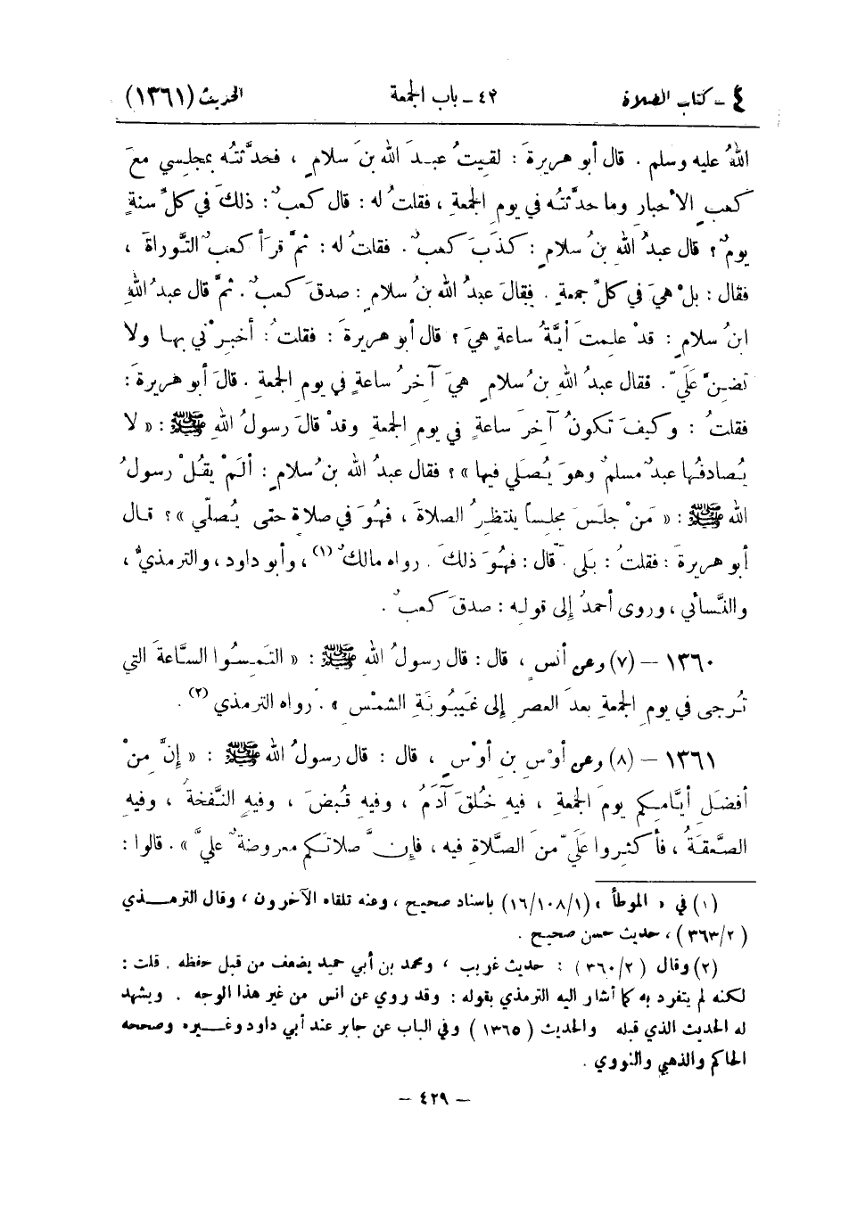 وَعَنْ أَنَسٍ قَالَ: قَالَ رَسُولُ اللَّهِ صَلَّى اللَّهُ عَلَيْهِ وَسَلَّمَ: «الْتَمِسُوا السَّاعَةَ الَّتِي تُرْجَى فِي وَيَوْم الْجُمُعَةِ بَعْدَ الْعَصْرِ إِلَى غَيْبُوبَةِ الشَّمْسِ» . رَوَاهُ التِّرْمِذِيّ
