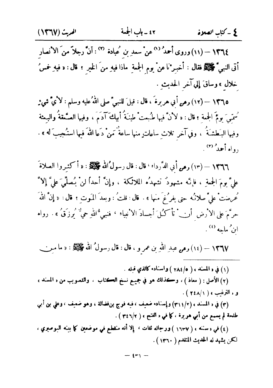 وَرَوَى أَحْمَدُ عَنْ سَعْدِ بْنِ عُبَادَةَ: أَنَّ رَجُلًا مِنَ الْأَنْصَارِ أَتَى النَّبِيَّ صَلَّى اللَّهُ عَلَيْهِ وَسَلَّمَ فَقَالَ: أَخْبِرْنَا عَنْ يَوْمِ الْجُمُعَةِ مَاذَا فِيهِ مِنَ الْخَيْرِ؟ قَالَ: «فِيهِ خَمْسُ خلال» وسَاق الحَدِيث