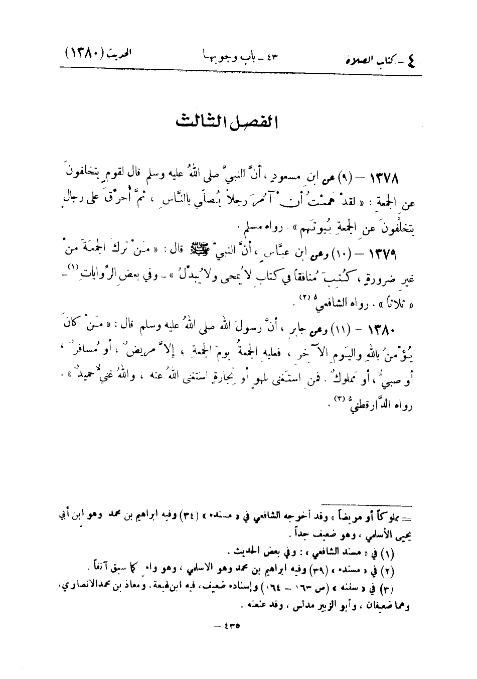 وَعَنِ ابْنِ عَبَّاسٍ أَنَّ النَّبِيَّ صَلَّى اللَّهُ عَلَيْهِ وَسَلَّمَ قَالَ: «مَنْ تَرَكَ الْجُمُعَةُ مِنْ غَيْرِ ضَرُورَةٍ كُتِبَ مُنَافِقًا فِي كِتَابٍ لَا يُمْحَى وَلَا يُبَدَّلُ» . وَفِي بَعْضِ الرِّوَايَاتِ ثَلَاثًا. رَوَاهُ الشَّافِعِي