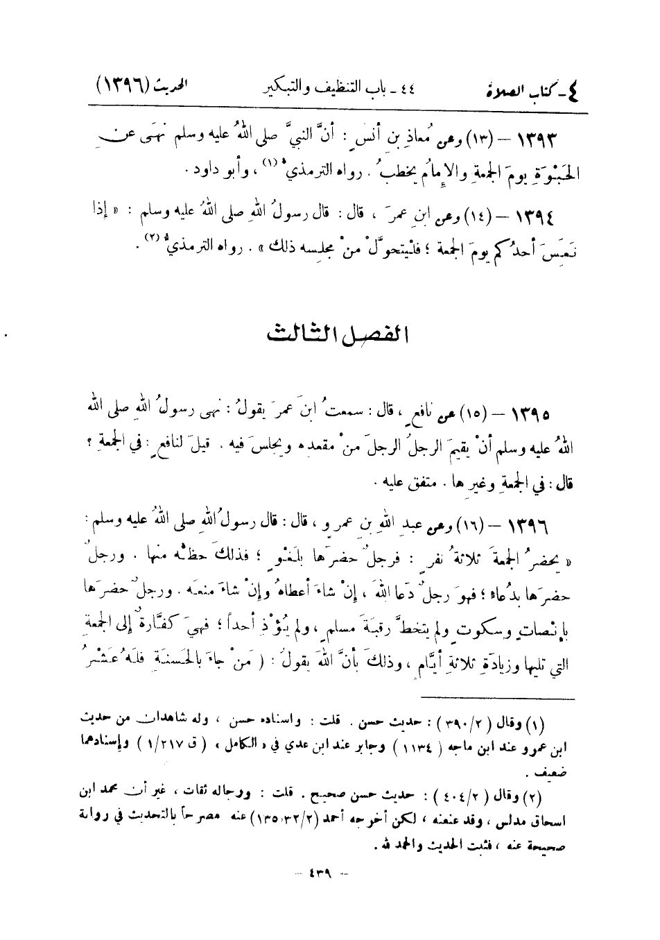 وَعَنْ عَبْدِ اللَّهِ بْنِ عَمْرٍو قَالَ: قَالَ رَسُولُ اللَّهِ صَلَّى اللَّهُ عَلَيْهِ وَسَلَّمَ: " يَحْضُرُ الْجُمُعَةَ ثَلَاثَةُ نَفَرٍ: فَرَجُلٌ حَضَرَهَا بِلَغْوٍ فَذَلِكَ حَظُّهُ مِنْهَا. وَرَجُلٌ حَضَرَهَا بِدُعَاءٍ فَهُوَ رَجُلٌ دَعَا اللَّهَ إِنْ شَاءَ أَعْطَاهُ وَإِنْ شَاءَ مَنعه. وَرجل حَضَره بِإِنْصَاتٍ وَسُكُوتٍ وَلَمْ يَتَخَطَّ رَقَبَةَ مُسْلِمٍ وَلَمْ يُؤْذِ أَحَدًا فَهِيَ كَفَّارَةٌ إِلَى الْجُمُعَةِ الَّتِي تَلِيهَا وَزِيَادَةِ ثَلَاثَةِ أَيَّامٍ وَذَلِكَ بِأَنَّ اللَّهَ يَقُولُ: (مَنْ جَاءَ بِالْحَسَنَةِ فَلَهُ عَشْرُ -[440]- أَمْثَالِهَا. .)