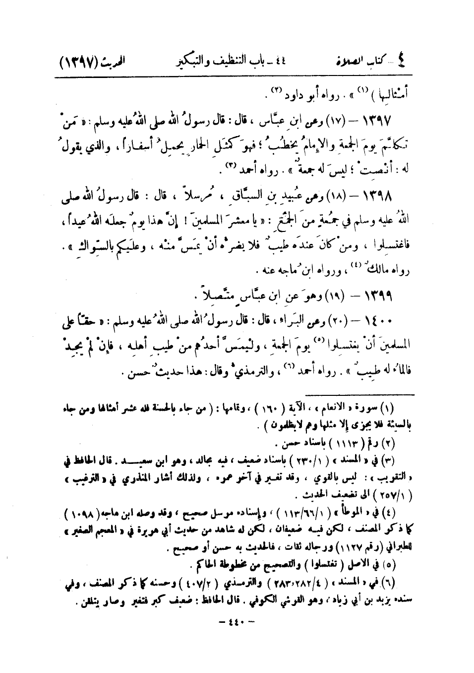 وَعَنِ الْبَرَاءِ قَالَ: قَالَ رَسُولُ اللهِ صَلَّى اللَّهُ عَلَيْهِ وَسَلَّمَ: «حَقًّا عَلَى الْمُسْلِمِينَ أَنْ يَغْتَسِلُوا يَوْمَ الْجُمُعَةِ وَلْيَمَسَّ أَحَدُهُمْ مِنْ طِيبِ أَهْلِهِ فَإِنْ لَمْ يَجِدْ فَالْمَاءُ لَهُ طِيبٌ» . رَوَاهُ أَحْمَدُ وَالتِّرْمِذِيُّ وَقَالَ: هَذَا حَدِيثٌ حَسَنٌ