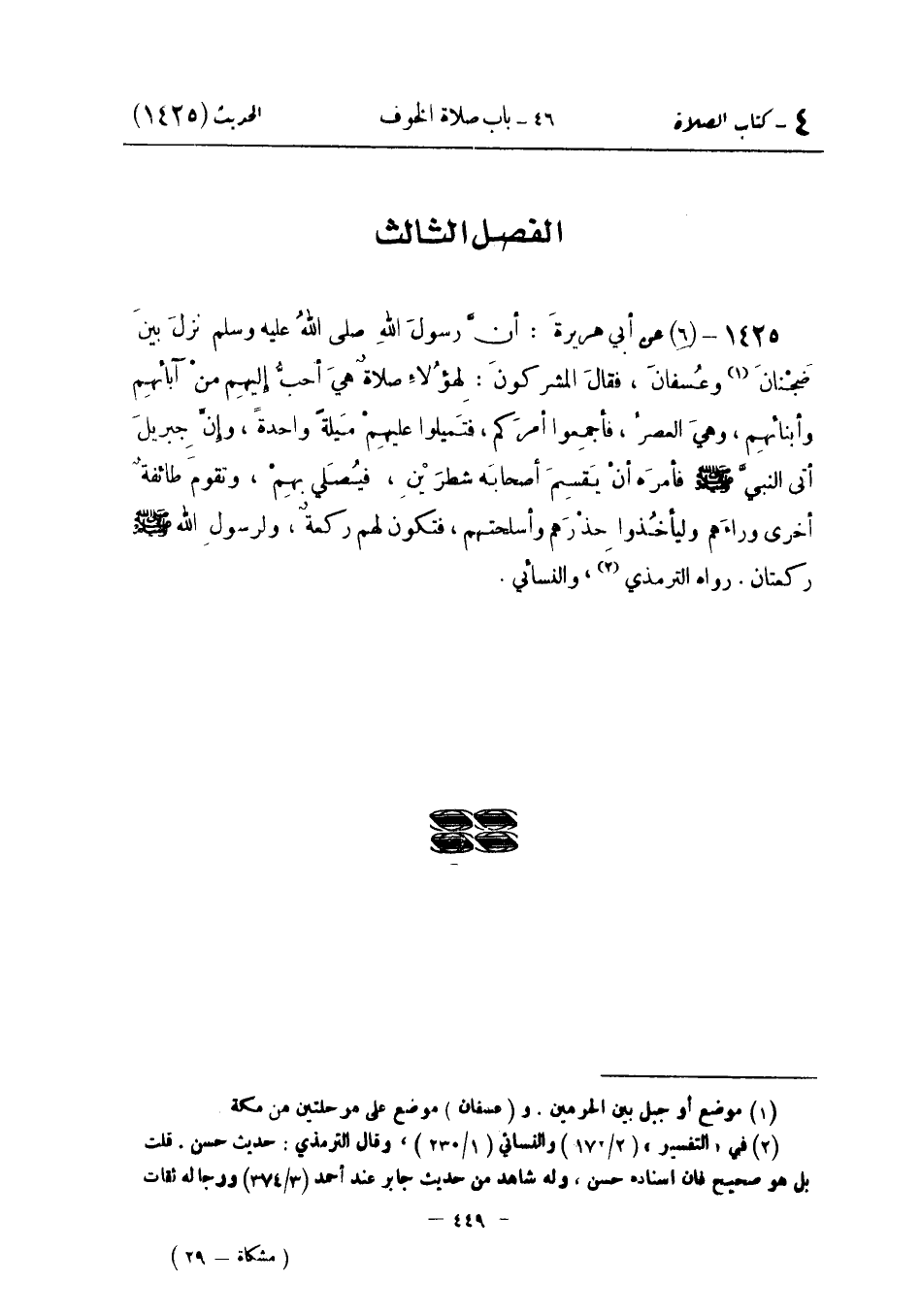 عَنْ أَبِي هُرَيْرَةَ: أَنَّ رَسُولَ اللَّهِ صَلَّى اللَّهُ عَلَيْهِ وَسَلَّمَ نَزَلَ بَيْنَ ضَجْنَانَ وَعُسْفَانَ فَقَالَ الْمُشْرِكُونَ: لِهَؤُلَاءِ صَلَاةٌ هِيَ أَحَبُّ إِلَيْهِمْ مِنْ آبَائِهِمْ وَأَبْنَائِهِمْ وَهِيَ الْعَصْرُ فَأَجْمِعُوا أَمْرَكُمْ فَتَمِيلُوا عَلَيْهِمْ مَيْلَةً وَاحِدَةً وَإِنَّ جِبْرِيلَ أَتَى النَّبِيَّ صَلَّى اللَّهُ عَلَيْهِ وَسَلَّمَ فَأَمَرَهُ أَنْ يَقْسِمَ أَصْحَابَهُ شَطْرَيْنِ فَيُصَلِّيَ بِهِمْ وَتَقُومَ طَائِفَةٌ أُخْرَى وَرَاءَهُمْ وَلْيَأْخُذُوا حِذْرَهُمْ وَأَسْلِحَتَهُمْ فَتَكُونَ لَهُمْ رَكْعَةٌ وَلِرَسُولِ اللَّهِ صَلَّى اللَّهُ عَلَيْهِ وَسَلَّمَ رَكْعَتَانِ. رَوَاهُ التِّرْمِذِيّ وَالنَّسَائِيّ