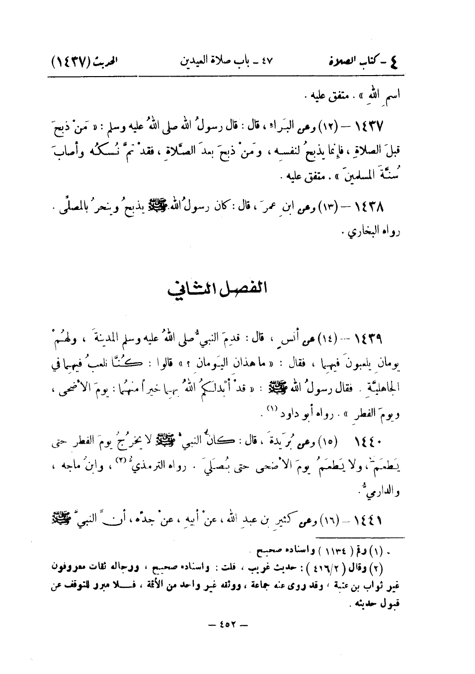وَعَن بُرَيْدَة قَالَ: كَانَ النَّبِيُّ صَلَّى اللَّهُ عَلَيْهِ وَسَلَّمَ لَا يَخْرُجُ يَوْمَ الْفِطْرِ حَتَّى يَطْعَمَ وَلَا يَطْعَمُ يَوْمَ الْأَضْحَى حَتَّى يُصَلِّيَ. رَوَاهُ التِّرْمِذِيُّ وَابْن مَاجَه والدارمي