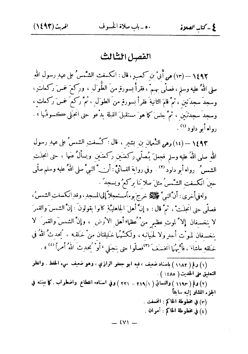 وَعَنِ النُّعْمَانِ بْنِ بَشِيرٍ قَالَ: كَسَفَتِ الشَّمْسُ عَلَى عَهْدِ رَسُولِ اللَّهِ صَلَّى اللَّهُ عَلَيْهِ وَسَلَّمَ فَجَعَلَ يُصَلِّي رَكْعَتَيْنِ رَكْعَتَيْنِ وَيَسْأَلُ عَنْهَا حَتَّى انْجَلَتِ الشَّمْسُ. رَوَاهُ أَبُو دَاوُدَ. وَفِي رِوَايَةِ النَّسَائِيِّ: أَنَّ النَّبِيَّ صَلَّى اللَّهُ عَلَيْهِ وَسَلَّمَ صَلَّى حِينَ انْكَسَفَتِ الشَّمْسُ مِثْلَ صَلَاتِنَا يَرْكَعُ وَيَسْجُدُ