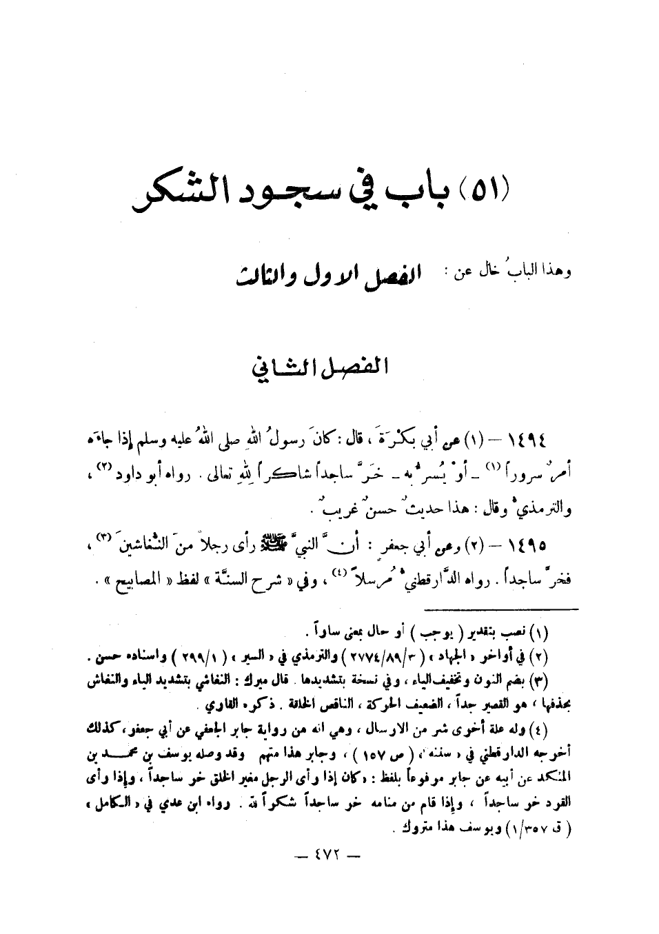 عَنْ أَبِي بَكْرَةَ قَالَ: كَانَ رَسُولُ اللَّهِ صَلَّى اللَّهُ عَلَيْهِ وَسَلَّمَ إِذَا جَاءَهُ أَمْرٌ سُرُورًا أَوْ يُسَرُّ بِهِ خَرَّ سَاجِدًا شَاكِرًا لِلَّهِ تَعَالَى. رَوَاهُ أَبُو دَاوُدَ وَالتِّرْمِذِيُّ وَقَالَ: هَذَا حَدِيثٌ حسن غَرِيب