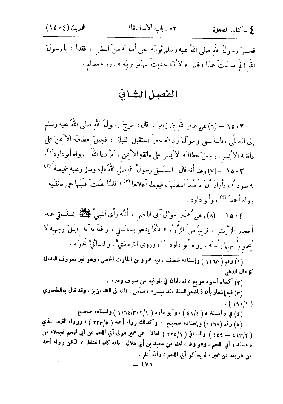 وَعَن عُمَيْر مولى آبي اللَّحْم أَنَّهُ رَأَى النَّبِيَّ صَلَّى اللَّهُ عَلَيْهِ وَسَلَّمَ يَسْتَسْقِي عِنْدَ أَحْجَارِ الزَّيْتِ قَرِيبًا مِنَ الزَّوْرَاءِ قَائِمًا يَدْعُو يَسْتَسْقِي رَافِعًا يَدَيْهِ قِبَلَ وَجْهِهِ لَا يُجَاوِزُ بِهِمَا رَأْسَهُ. رَوَاهُ أَبُو دَاوُدَ وروى التِّرْمِذِيّ وَالنَّسَائِيّ نَحوه