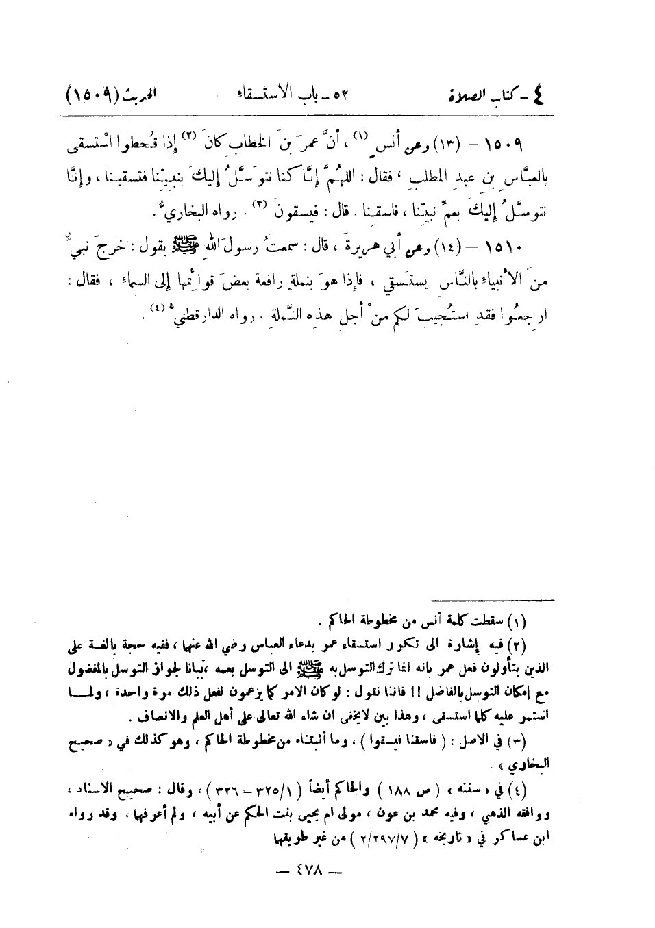وَعَنْ أَنَسٍ أَنَّ عُمَرَ بْنَ الْخَطَّابِ كَانَ إِذْ قحطوا استسقى بالبعاس بْنِ عَبْدِ الْمُطَّلِبِ فَقَالَ: اللَّهُمَّ إِنَّا كُنَّا نَتَوَسَّلُ إِلَيْكَ بِنَبِيِّنَا فَتَسْقِينَا وَإِنَّا نَتَوَسَّلُ إِلَيْكَ بِعَمِّ نَبِيِّنَا فَاسْقِنَا. قَالَ: فَيُسْقَوْنَ. رَوَاهُ الْبُخَارِيُّ