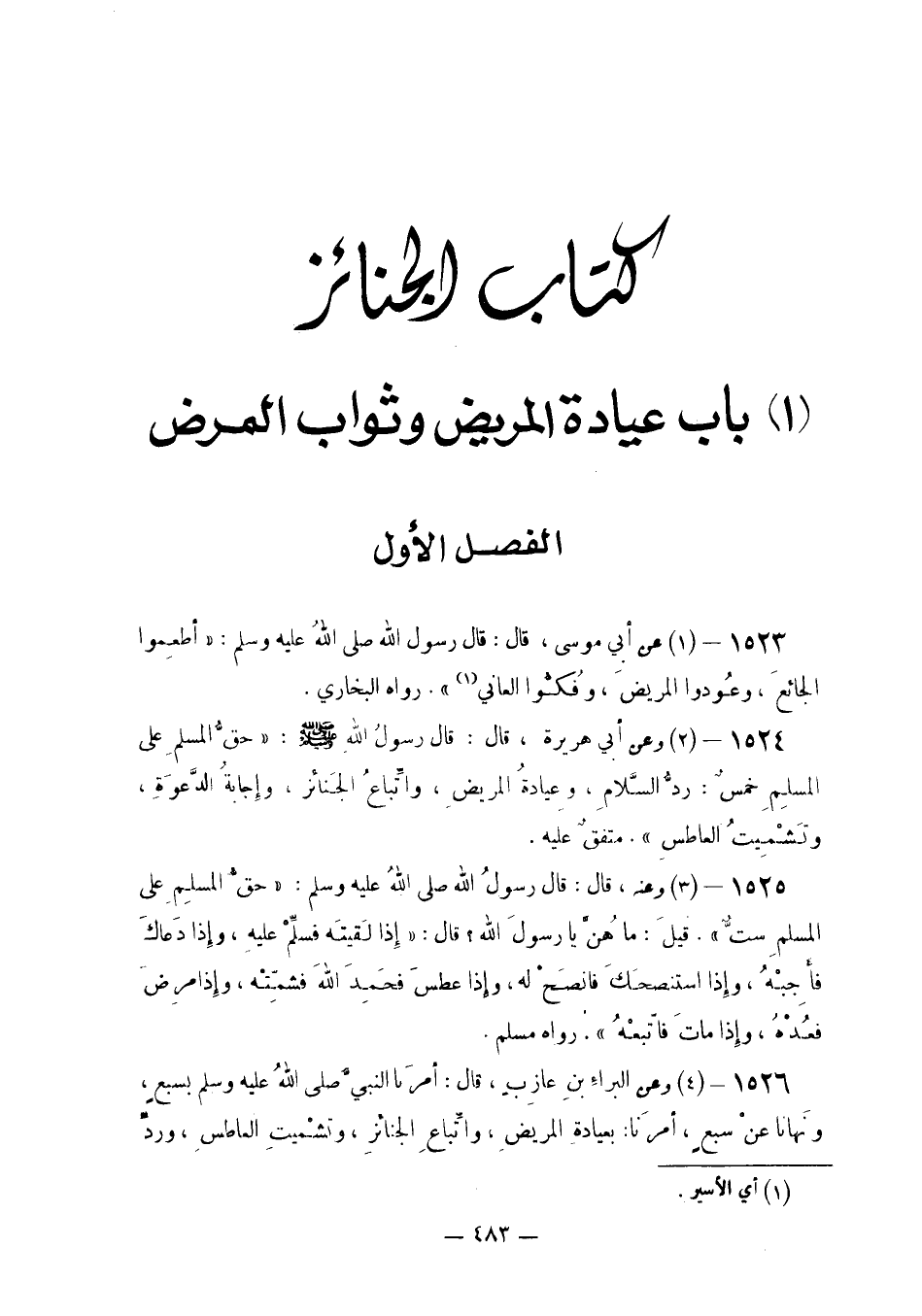 عَنْ أَبِي مُوسَى قَالَ: قَالَ رَسُولُ اللَّهِ صَلَّى اللَّهُ عَلَيْهِ وَسَلَّمَ: «أَطْعِمُوا الْجَائِعَ وَعُودُوا الْمَرِيض وفكوا العاني» . رَوَاهُ البُخَارِيّ