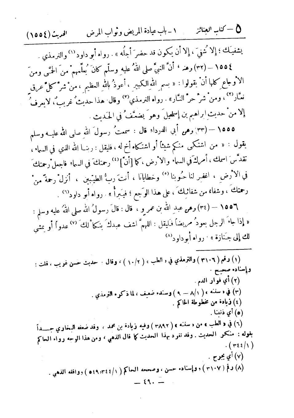 وَعَنْ عَبْدِ اللَّهِ بْنِ عَمْرٍو قَالَ: قَالَ رَسُولُ اللَّهِ صَلَّى اللَّهُ عَلَيْهِ وَسَلَّمَ: «إِذَا جَاءَ الرجل يعود مَرِيضا فَلْيقل ك اللَّهُمَّ اشْفِ عَبْدَكَ يَنْكَأُ لَكَ عَدُوًّا أَوْ يَمْشِي لَكَ إِلَى جِنَازَةٍ» رَوَاهُ أَبُو دَاوُدَ
