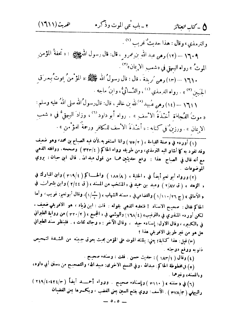 وَعَنْ بُرَيْدَةَ قَالَ: قَالَ رَسُولُ اللَّهِ صَلَّى اللَّهُ عَلَيْهِ وَسَلَّمَ: «الْمُؤْمِنُ يَمُوتُ بِعَرَقِ الْجَبِينِ» . رَوَاهُ التِّرْمِذِيّ وَالنَّسَائِيّ وَابْن مَاجَه