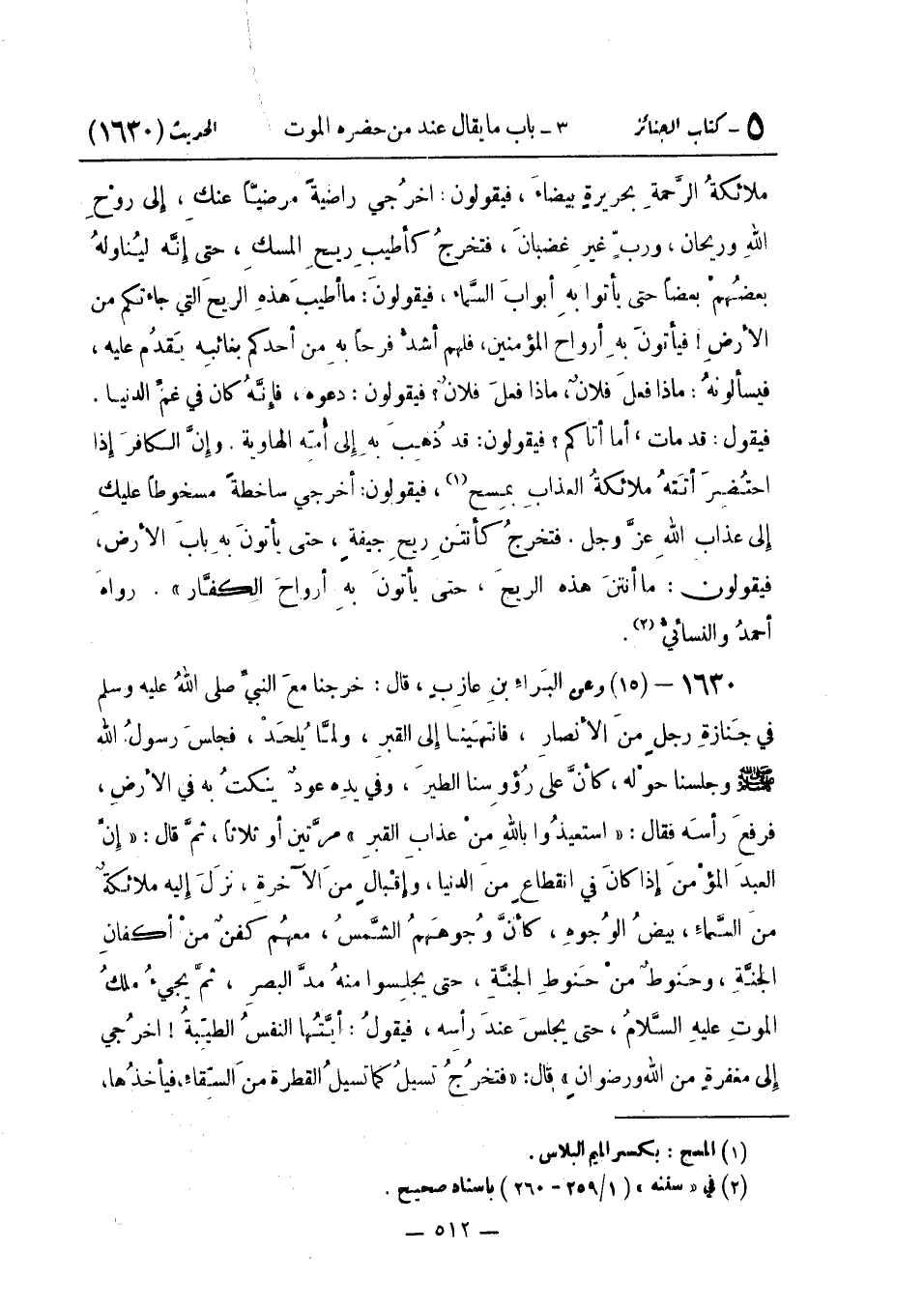 وَعَنِ الْبَرَاءِ بْنِ عَازِبٍ قَالَ: خَرَجْنَا مَعَ النَّبِيِّ صَلَّى اللَّهُ عَلَيْهِ وَسَلَّمَ فِي جَنَازَة رَجُلٍ مِنَ الْأَنْصَارِ فَانْتَهَيْنَا إِلَى الْقَبْرِ وَلَمَّا يُلْحَدْ فَجَلَسَ رَسُولُ اللَّهِ صَلَّى اللَّهُ عَلَيْهِ وَسَلَّمَ وَجَلَسْنَا حوله كَأَن على رؤوسنا الطَّيْرَ وَفِي يَدِهِ عُودٌ يَنْكُتُ بِهِ فِي الْأَرْضِ فَرَفَعَ رَأْسَهُ فَقَالَ: «اسْتَعِيذُوا بِاللَّهِ مِنْ عَذَابِ الْقَبْرِ» مَرَّتَيْنِ أَوْ ثَلَاثًا ثُمَّ قَالَ: " إِنَّ الْعَبْدَ الْمُؤْمِنَ إِذَا كَانَ فِي انْقِطَاعٍ مِنَ الدُّنْيَا وَإِقْبَالٍ مِنَ الْآخِرَةِ نَزَلَ إِلَيْهِ من السَّمَاء مَلَائِكَة بِيضُ الْوُجُوهِ كَأَنَّ وُجُوهَهُمُ الشَّمْسُ مَعَهُمْ كَفَنٌ مِنْ أَكْفَانِ الْجَنَّةِ وَحَنُوطٌ مِنْ حَنُوطِ الْجَنَّةِ حَتَّى يَجْلِسُوا مِنْهُ مَدَّ الْبَصَرِ ثُمَّ يَجِيءُ مَلَكُ الْمَوْتِ حَتَّى يَجْلِسَ عِنْدَ رَأْسِهِ فَيَقُولُ: أَيَّتُهَا النَّفْسُ الطَّيِّبَةُ اخْرُجِي إِلَى مَغْفِرَةٍ مِنَ الله ورضوان " قَالَ: «فَتَخْرُجُ تَسِيلُ كَمَا تَسِيلُ الْقَطْرَةُ مِنَ فِي السِّقَاءِ فَيَأْخُذُهَا -[513]- فَإِذَا أَخَذَهَا لَمْ يَدَعُوهَا فِي يَدِهِ طَرْفَةَ عَيْنٍ حَتَّى يَأْخُذُوهَا فَيَجْعَلُوهَا فِي ذَلِكَ الْكَفَنِ وَفِي ذَلِكَ الْحَنُوطِ وَيَخْرُجُ مِنْهَا كَأَطْيَبِ نَفْحَةِ مِسْكٍ وُجِدَتْ عَلَى وَجْهِ الْأَرْضِ» قَالَ: " فَيَصْعَدُونَ بِهَا فَلَا يَمُرُّونَ - يَعْنِي بِهَا - عَلَى مَلَأٍ مِنَ الْمَلَائِكَةِ إِلَّا قَالُوا: مَا هَذِه الرّوح الطّيب فَيَقُولُونَ: فلَان بن فُلَانٍ بِأَحْسَنِ أَسْمَائِهِ الَّتِي كَانُوا يُسَمُّونَهُ بِهَا فِي الدُّنْيَا حَتَّى ينْتَهوا بهَا إِلَى سَمَاء الدُّنْيَا فيستفتحون لَهُ فَيفتح لَهُ فَيُشَيِّعُهُ مِنْ كُلِّ سَمَاءٍ مُقَرَّبُوهَا إِلَى السَّمَاءِ الَّتِي تَلِيهَا حَتَّى ينتهى بهَا إِلَى السَّمَاءِ السَّابِعَةِ - فَيَقُولُ اللَّهُ عَزَّ وَجَلَّ: اكْتُبُوا كِتَابَ عَبْدِي فِي عِلِّيِّينَ وَأَعِيدُوهُ إِلَى الْأَرْضِ فَإِنِّي مِنْهَا خَلَقْتُهُمْ وَفِيهَا أُعِيدُهُمْ وَمِنْهَا أخرجهم تَارَة أُخْرَى قَالَ: " فتعاد روحه فيأتيه ملكان فَيُجْلِسَانِهِ فَيَقُولُونَ لَهُ: مَنْ رَبُّكَ؟ فَيَقُولُ: رَبِّيَ الله فَيَقُولُونَ لَهُ: مَا دِينُكَ؟ فَيَقُولُ: دِينِيَ الْإِسْلَامُ فَيَقُولَانِ لَهُ: مَا هَذَا الرَّجُلُ الَّذِي بُعِثَ فِيكُمْ؟ فَيَقُول: هُوَ رَسُولُ اللَّهِ صَلَّى اللَّهُ عَلَيْهِ وَسَلَّمَ فَيَقُولَانِ لَهُ: وَمَا عِلْمُكَ؟ فَيَقُولُ: قَرَأْتُ كِتَابَ اللَّهِ فَآمَنْتُ بِهِ وَصَدَّقْتُ فَيُنَادِي مُنَادٍ مِنَ السَّمَاء أَن قد صدق فَأَفْرِشُوهُ مِنَ الْجَنَّةِ وَأَلْبِسُوهُ مِنَ الْجَنَّةِ وَافْتَحُوا لَهُ بَابًا إِلَى الْجَنَّةِ " قَالَ: «فَيَأْتِيهِ مِنْ رَوْحِهَا وَطِيبِهَا وَيُفْسَحُ لَهُ فِي قَبْرِهِ مَدَّ بَصَرِهِ» قَالَ: " وَيَأْتِيهِ رجل حسن الْوَجْه حسن الثِّيَاب طيب الرّيح فَيَقُولُ: أَبْشِرْ بِالَّذِي يَسُرُّكَ هَذَا يَوْمُكَ الَّذِي كُنْتَ تُوعَدُ فَيَقُولُ لَهُ: مَنْ أَنْتَ؟ فَوَجْهُكَ الْوَجْه يَجِيء بِالْخَيْرِ فَيَقُولُ: أَنَا عَمَلُكَ الصَّالِحُ فَيَقُولُ: رَبِّ أَقِمِ السَّاعَةَ رَبِّ أَقِمِ السَّاعَةَ حَتَّى أَرْجِعَ إِلَى أَهْلِي وَمَالِي ". قَالَ: " وَإِنَّ الْعَبْدَ الْكَافِرَ إِذَا كَانَ فِي انْقِطَاعٍ مِنَ الدُّنْيَا وَإِقْبَالٍ مِنَ الْآخِرَةِ نَزَلَ إِلَيْهِ مِنَ السَّمَاءِ مَلَائِكَةٌ سُودُ الْوُجُوهِ مَعَهُمُ الْمُسُوحُ -[514]- فَيَجْلِسُونَ مِنْهُ مَدَّ الْبَصَرِ ثُمَّ يَجِيءُ مَلَكُ الْمَوْتِ حَتَّى يَجْلِسَ عِنْدَ رَأْسِهِ فَيَقُولُ: أَيَّتُهَا النَّفْسُ الْخَبِيثَةُ اخْرُجِي إِلَى سَخَطٍ مِنَ اللَّهِ " قَالَ: " فَ
