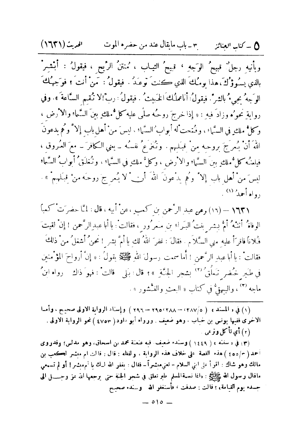 وَعَنْ عَبْدِ الرَّحْمَنِ بْنِ كَعْبٍ عَنْ أَبِيهِ قَالَ: لَمَّا حَضَرَتْ كَعْبًا الْوَفَاةُ أَتَتْهُ أُمُّ بِشْرٍ بِنْتُ الْبَرَاءِ بْنِ مَعْرُورٍ فَقَالَتْ: يَا أَبَا عَبْدِ الرَّحْمَنِ إِنْ لَقِيتَ فُلَانًا فَاقْرَأْ عَلَيْهِ مِنِّي السَّلَامَ. فَقَالَ: غَفَرَ اللَّهُ لَكِ يَا أُمَّ بِشْرٍ نَحْنُ أَشْغَلُ مِنْ ذَلِكَ فَقَالَتْ: يَا أَبَا عَبْدِ الرَّحْمَنِ أَمَا سَمِعْتُ رَسُولَ اللَّهِ صَلَّى اللَّهُ عَلَيْهِ وَسَلَّمَ يَقُول: «إِنَّ أَرْوَاحَ الْمُؤْمِنِينَ فِي طَيْرٍ خُضْرٍ تَعْلُقُ بِشَجَرِ الْجَنَّةِ؟» قَالَ: بَلَى. قَالَتْ: فَهُوَ ذَاكَ. رَوَاهُ ابْنُ مَاجَهْ وَالْبَيْهَقِيُّ فِي كِتَابِ الْبَعْثِ والنشور