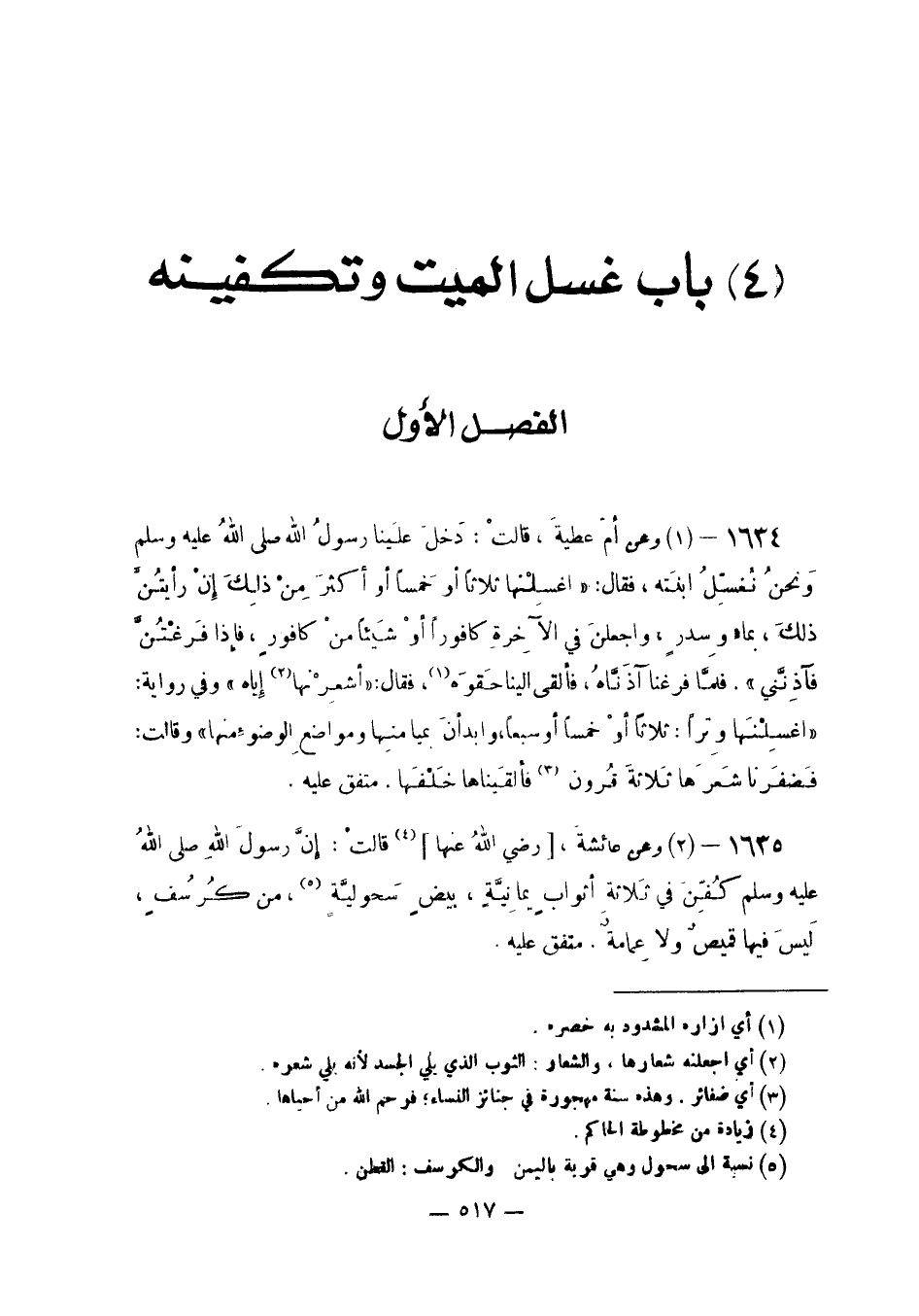 عَنْ أُمِّ عَطِيَّةَ قَالَتْ: دَخَلَ عَلَيْنَا رَسُولُ اللَّهِ صَلَّى اللَّهُ عَلَيْهِ وَسَلَّمَ وَنَحْنُ نُغَسِّلُ ابْنَتَهُ فَقَالَ: اغْسِلْنَهَا ثَلَاثًا أَوْ خَمْسًا أَوْ أَكْثَرَ مِنْ ذَلِكِ إِنْ رَأَيْتُنَّ ذَلِكَ بِمَاءٍ وَسِدْرٍ وَاجْعَلْنَ فِي الْآخِرَةِ كَافُورًا أَوْ شَيْئًا مِنْ كَافُورٍ فَإِذَا فَرَغْتُنَّ فَآذِنَّنِي فَلَمَّا فَرَغْنَا آذناه فَألْقى إِلَيْنَا حقوه وَقَالَ: «أَشْعِرْنَهَا إِيَّاهُ» وَفِي رِوَايَةٍ: " اغْسِلْنَهَا وِتْرًا: ثَلَاثًا أَوْ خَمْسًا أَوْ سَبْعًا وَابْدَأْنَ بِمَيَامِنِهَا وَمَوَاضِعِ الْوُضُوءِ مِنْهَا ". وَقَالَتْ فَضَفَّرْنَا شَعَرَهَا ثَلَاثَةَ قُرُونٍ فألقيناها خلفهَا
