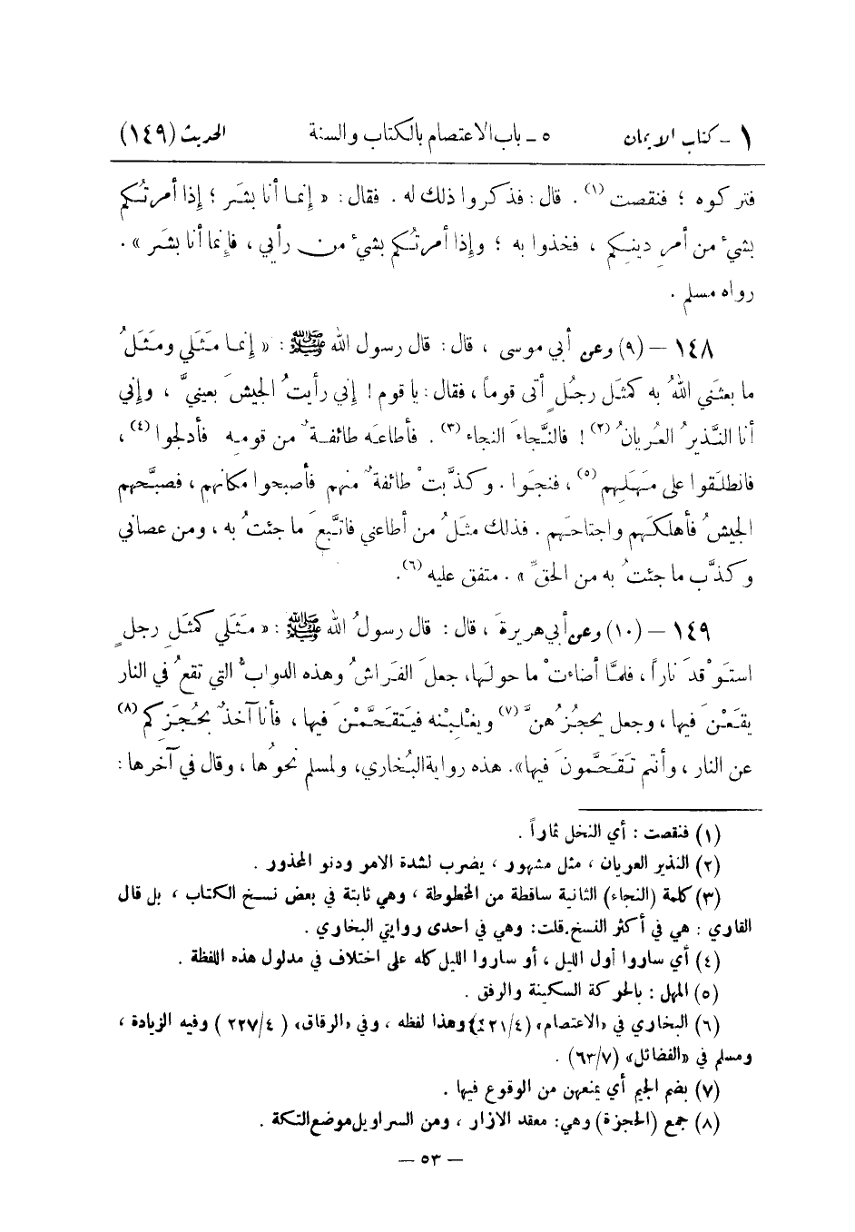 وَعَنْ أَبِي مُوسَى قَالَ: قَالَ رَسُولُ اللَّهِ صَلَّى اللَّهُ عَلَيْهِ وَسَلَّمَ: «إِنَّمَا مَثَلِي وَمَثَلُ مَا بَعَثَنِي اللَّهُ بِهِ كَمَثَلِ رَجُلٍ أَتَى قَوْمًا فَقَالَ يَا قَوْمِ إِنِّي رَأَيْتُ الْجَيْشَ بِعَيْنِي وَإِنِّي أَنَا النَّذِيرُ الْعُرْيَانُ فَالنَّجَاءَ النَّجَاءَ فَأَطَاعَهُ طَائِفَةٌ مِنْ قَوْمِهِ فَأَدْلَجُوا فَانْطَلَقُوا عَلَى مَهْلِهِمْ فَنَجَوْا وَكَذَّبَتْ طَائِفَةٌ مِنْهُمْ فَأَصْبَحُوا مَكَانَهُمْ فَصَبَّحَهُمُ الْجَيْشُ فَأَهْلَكَهُمْ وَاجْتَاحَهُمْ فَذَلِكَ مَثَلُ مَنْ أَطَاعَنِي فَاتَّبَعَ مَا جِئْتُ بِهِ وَمثل من عَصَانِي وَكذب بِمَا جِئْتُ بِهِ مِنَ الْحَقِّ»