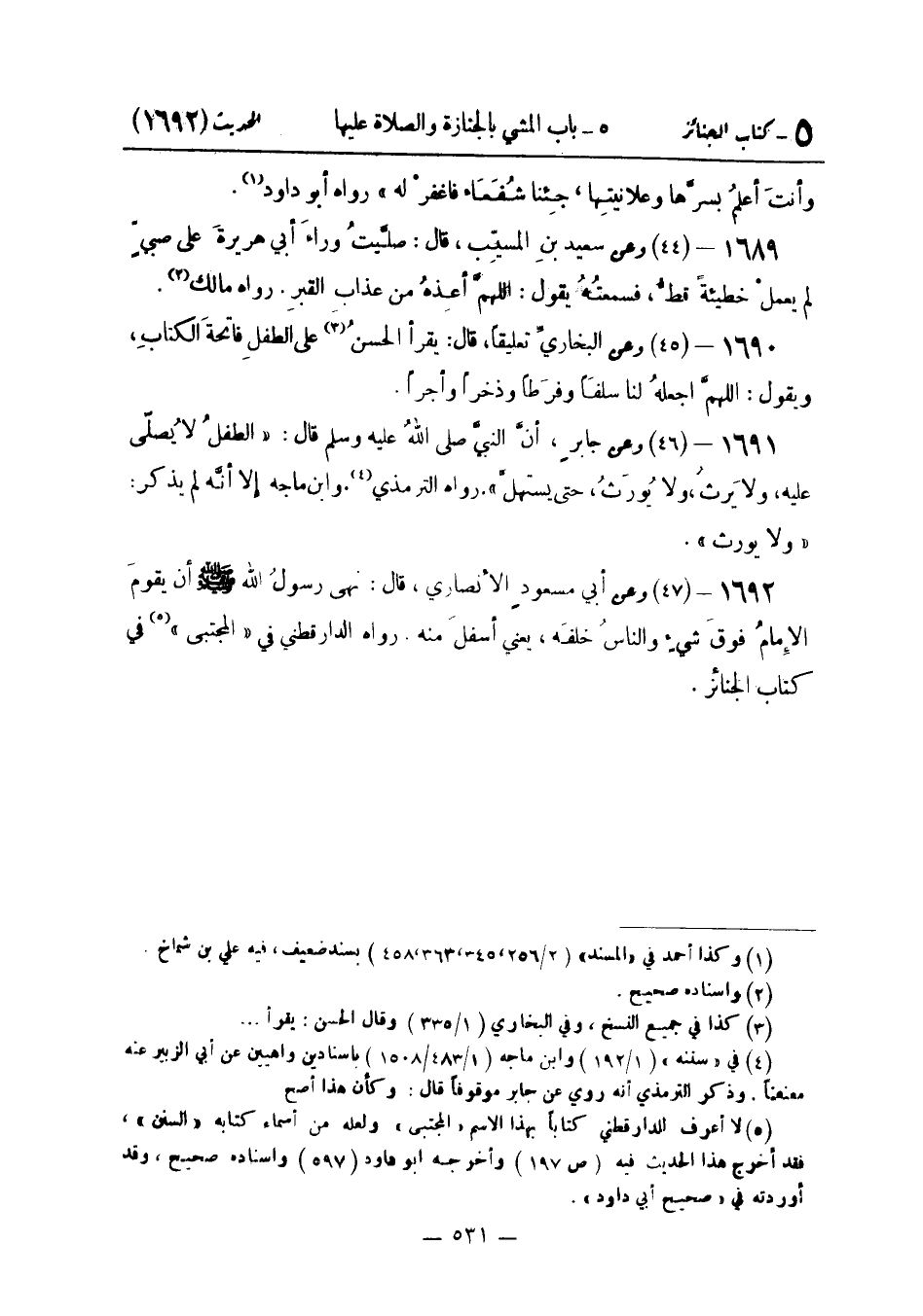 وَعَنْ جَابِرٌ أَنَّ النَّبِيَّ صَلَّى اللَّهُ عَلَيْهِ وَسَلَّمَ قَالَ: «الطِّفْلُ لَا يُصَلَّى عَلَيْهِ وَلَا يَرِثُ وَلَا يُوَرَّثُ حَتَّى يَسْتَهِلَّ» . رَوَاهُ التِّرْمِذِيُّ وَابْنُ مَاجَهْ إِلَّا أَنَّهُ لَمْ يَذْكُرْ: «وَلَا يُورث»
