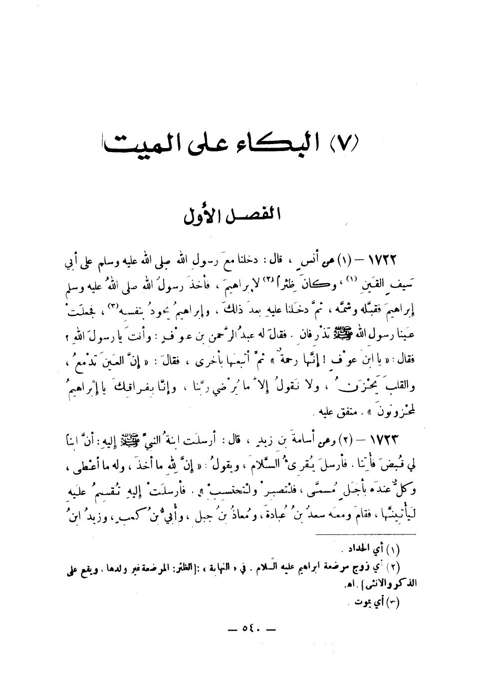 عَنْ أَنَسٍ قَالَ: دَخَلْنَا مَعَ رَسُولِ اللَّهِ صَلَّى اللَّهُ عَلَيْهِ وَسَلَّمَ عَلَى أَبِي سَيْفٍ الْقَيْنِ وَكَانَ ظِئْرًا لِإِبْرَاهِيمَ فَأَخَذَ رَسُولُ اللَّهِ صَلَّى اللَّهُ عَلَيْهِ وَسَلَّمَ إِبْرَاهِيمَ فَقَبَّلَهُ وَشَمَّهُ ثُمَّ دَخَلْنَا عَلَيْهِ بَعْدَ ذَلِكَ وَإِبْرَاهِيمُ يَجُودُ بِنَفْسِهِ فَجَعَلَتْ عَيْنَا رَسُولِ اللَّهِ صَلَّى اللَّهُ عَلَيْهِ وَسَلَّمَ تَذْرِفَانِ. فَقَالَ لَهُ عَبْدُ الرَّحْمَنِ بْنُ عَوْفٍ: وَأَنْتَ يَا رَسُولَ اللَّهِ؟ فَقَالَ: " يَا ابْنَ عَوْفٍ إِنَّهَا رَحْمَةٌ ثُمَّ أَتْبَعَهَا بِأُخْرَى فَقَالَ: إِنَّ الْعَيْنَ تَدْمَعُ وَالْقَلْبَ يَحْزَنُ وَلَا نَقُولُ إِلَّا مَا يُرْضِي رَبَّنَا وَإِنَّا بِفِرَاقِك يَا إِبْرَاهِيم لَمَحْزُونُونَ "