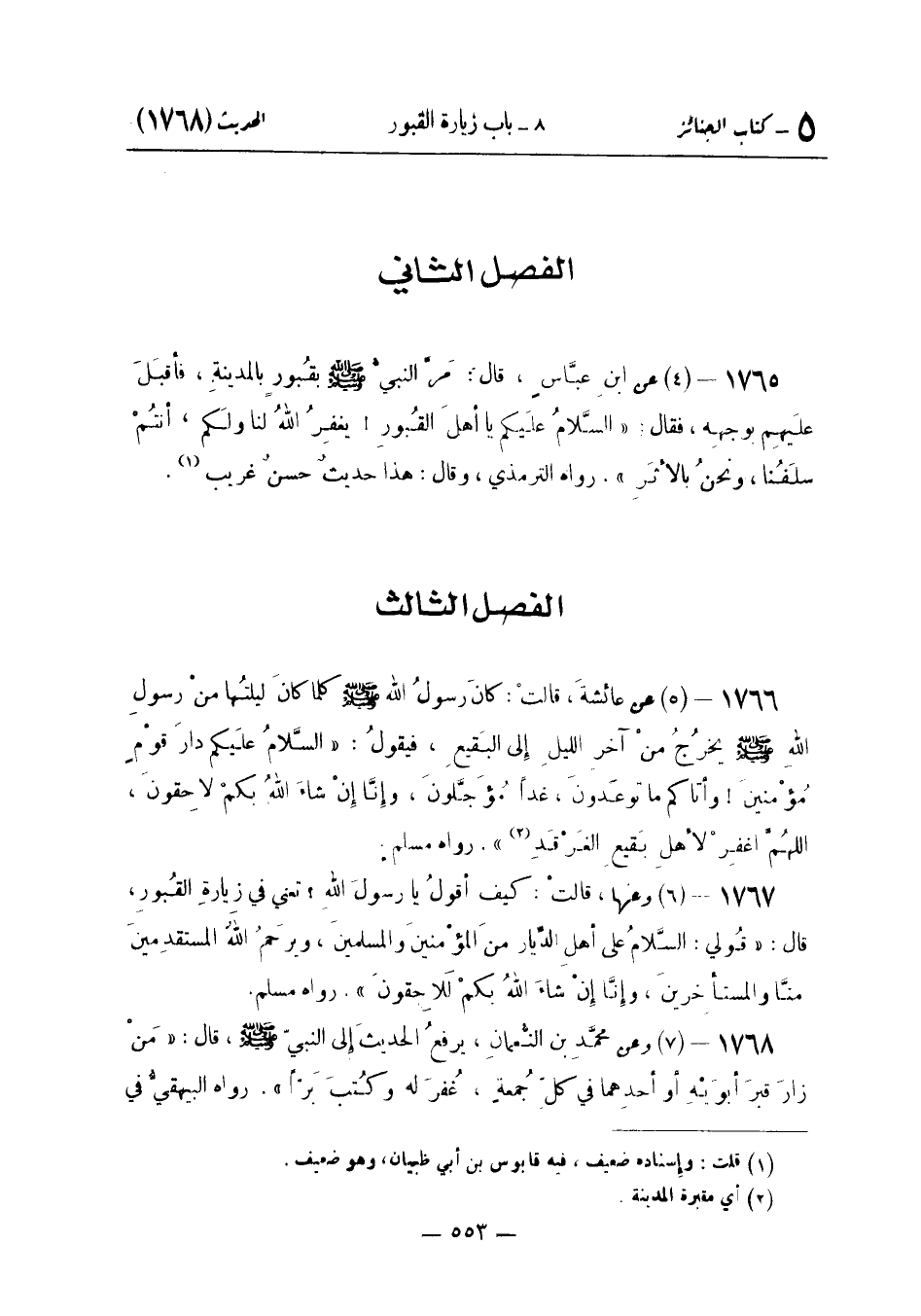 عَنِ ابْنِ عَبَّاسٍ قَالَ: مَرَّ النَّبِيُّ صَلَّى اللَّهُ عَلَيْهِ وَسَلَّمَ بِقُبُورٍ بِالْمَدِينَةِ فَأَقْبَلَ عَلَيْهِمْ بِوَجْهِهِ فَقَالَ: «السَّلَامُ عَلَيْكُمْ يَا أَهْلَ الْقُبُورِ يَغْفِرُ اللَّهُ لَنَا وَلَكُمْ أَنْتُمْ سَلَفُنَا وَنَحْنُ بِالْأَثَرِ» . رَوَاهُ التِّرْمِذِيُّ وَقَالَ: هَذَا حَدِيثٌ حَسَنٌ غَرِيبٌ