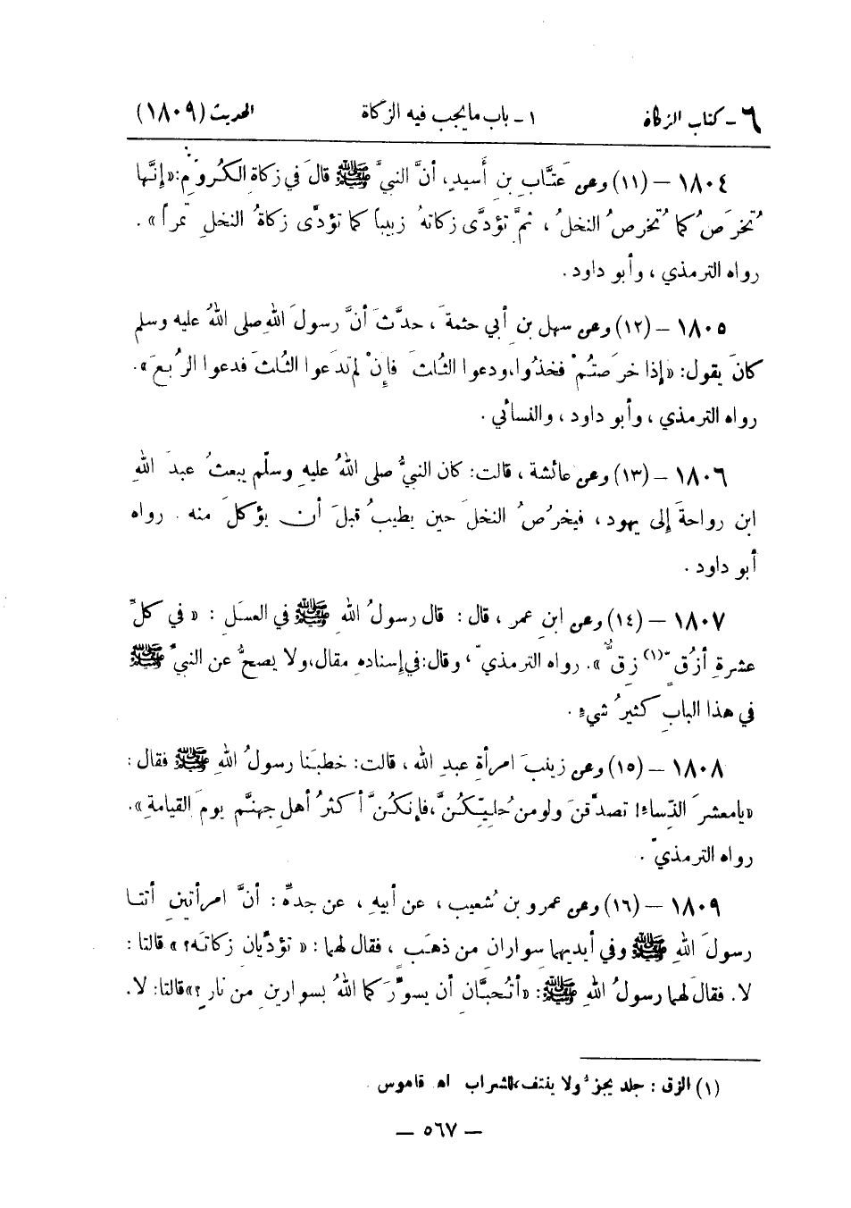 وَعَنْ عَتَّابِ بْنِ أَسِيدٍ أَنَّ النَّبِيَّ صَلَّى اللَّهُ عَلَيْهِ وَسَلَّمَ قَالَ فِي زَكَاةِ الْكُرُومِ: «إِنَّهَا تُخْرَصُ كَمَا تُخْرَصُ النَّخْلُ ثُمَّ تُؤَدَّى زَكَاتُهُ زَبِيبًا كَمَا تُؤَدَّى زَكَاةُ النَّخْلِ تَمْرًا» . رَوَاهُ التِّرْمِذِيّ وَأَبُو دَاوُد