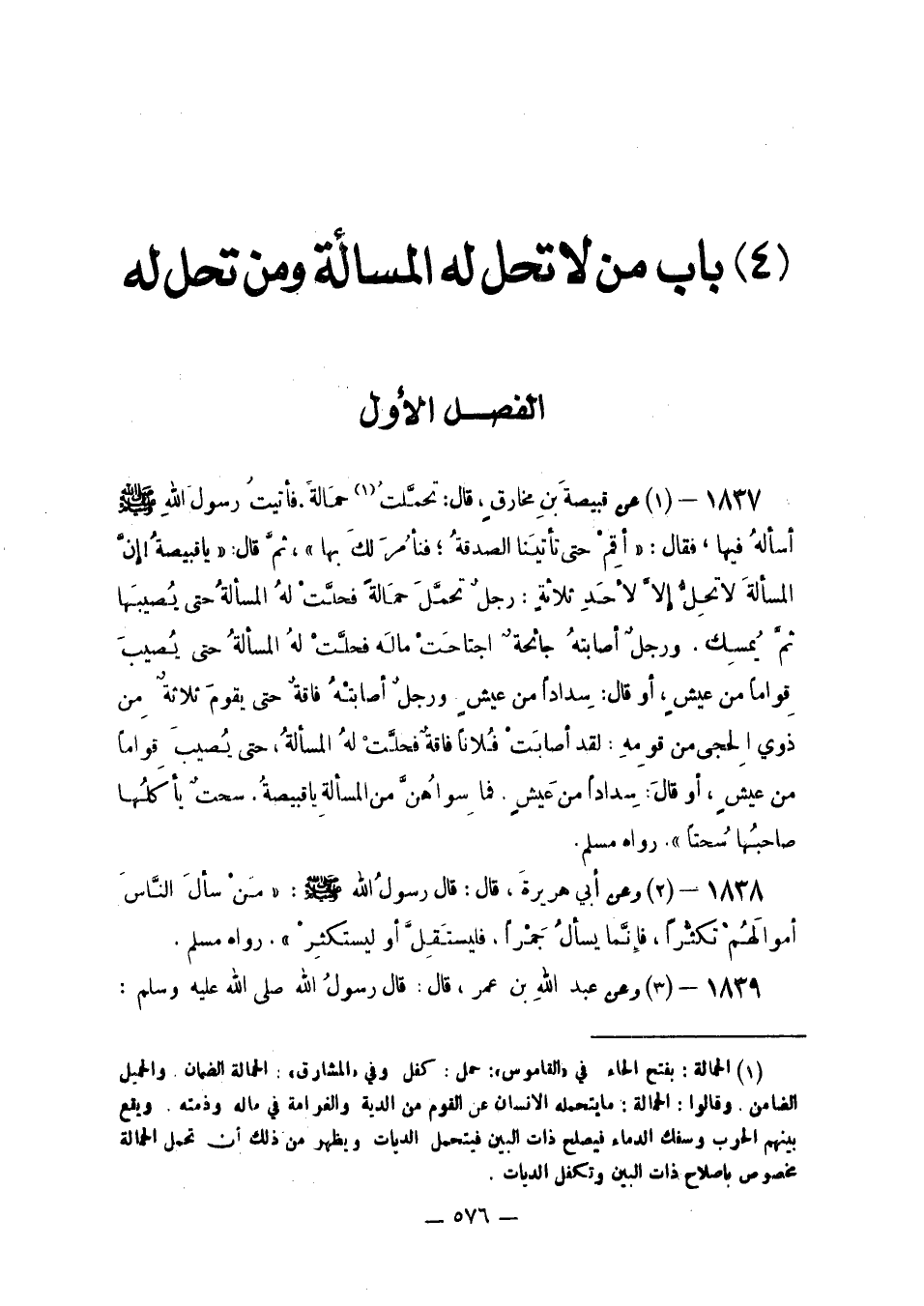عَن قبيصَة بن مُخَارق الْهِلَالِي قَالَ: تَحَمَّلْتُ حَمَالَةً فَأَتَيْتُ رَسُولَ اللَّهِ صَلَّى اللَّهُ عَلَيْهِ وَسَلَّمَ أَسْأَلُهُ فِيهَا. فَقَالَ: «أَقِمْ حَتَّى تَأْتِينَا الصَّدَقَة فنأمر لَك بهَا» . قَالَ ثُمَّ قَالَ: «يَا قَبِيصَةُ إِنَّ الْمَسْأَلَةَ لَا تَحِلُّ إِلَّا لِأَحَدِ ثَلَاثَةٍ رَجُلٍ تَحَمَّلَ حَمَالَةً فَحَلَّتْ لَهُ الْمَسْأَلَةُ حَتَّى يُصِيبَهَا ثُمَّ يُمْسِكُ وَرَجُلٍ أَصَابَتْهُ جَائِحَةٌ اجْتَاحَتْ مَالَهُ فَحَلَّتْ لَهُ الْمَسْأَلَةُ حَتَّى يُصِيبَ قِوَامًا مِنْ عَيْشٍ أَوْ قَالَ سِدَادًا مِنْ عَيْشٍ وَرَجُلٍ أَصَابَتْهُ فَاقَةٌ حَتَّى يقوم ثَلَاثَة من ذَوي الحجى مِنْ قَوْمِهِ. لَقَدْ أَصَابَتْ فُلَانًا فَاقَةٌ فَحَلَّتْ لَهُ الْمَسْأَلَةُ حَتَّى يُصِيبَ قِوَامًا مِنْ عَيْشٍ أَوْ قَالَ سِدَادًا مِنْ عَيْشٍ فَمَا سِوَاهُنَّ من الْمَسْأَلَة يَا قبيصَة سحتا يأكلها صَاحبهَا سحتا» . رَوَاهُ مُسلم