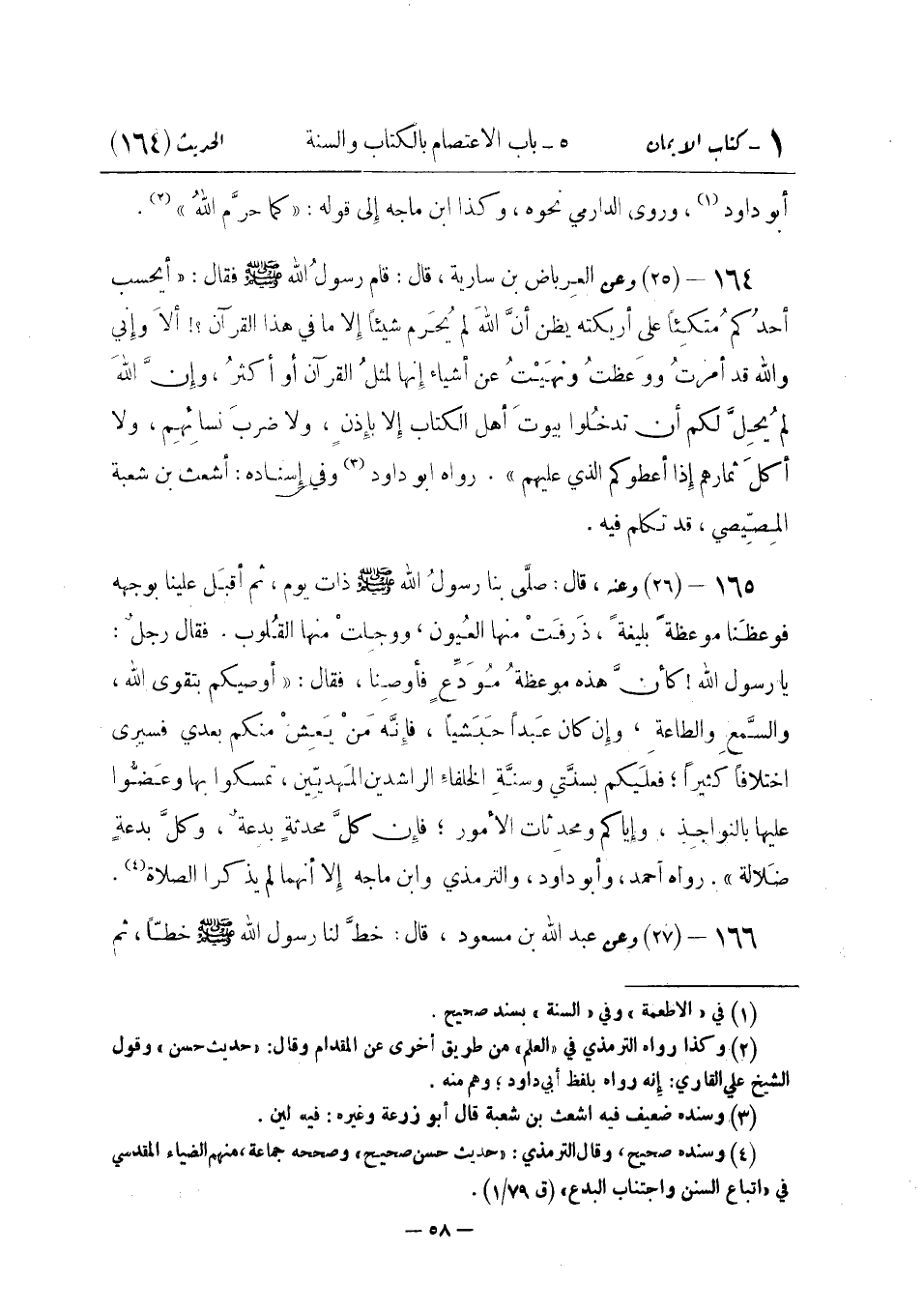 وَعَن الْعِرْبَاض بن سَارِيَة قَالَ: قَامَ رَسُولُ اللَّهِ صَلَّى اللَّهُ عَلَيْهِ وَسَلَّمَ فَقَالَ: «أيحسب أحدكُم متكأ عَلَى أَرِيكَتِهِ يَظُنُّ أَنَّ اللَّهَ لَمْ يُحَرِّمْ شَيْئًا إِلَّا مَا فِي هَذَا الْقُرْآنِ أَلَا وَإِنِّي وَاللَّهِ قَدْ أَمَرْتُ وَوَعَظْتُ وَنَهَيْتُ عَنَ أَشْيَاءَ إِنَّهَا لَمِثْلُ الْقُرْآنِ أَوْ أَكْثَرُ وَإِنَّ اللَّهَ لَمْ يُحِلَّ لَكُمْ أَنْ تَدْخُلُوا بُيُوتَ أَهْلِ الْكِتَابِ إِلَّا بِإِذْنٍ وَلَا ضَرْبَ نِسَائِهِمْ وَلَا أَكْلَ ثِمَارِهِمْ إِذَا أَعْطَوْكُمُ الَّذِي عَلَيْهِمْ» رَوَاهُ أَبُو دَاوُدَ وَفِي إِسْنَادِهِ: أَشْعَثُ بْنُ شُعْبَة المصِّيصِي قد تكلم فِيهِ