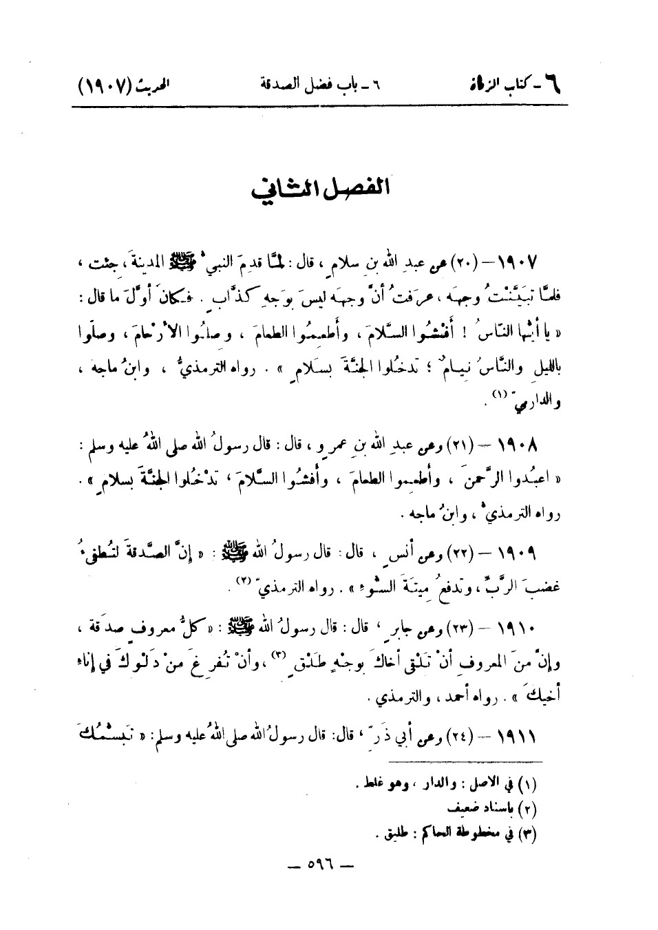 عَنْ عَبْدِ اللَّهِ بْنِ سَلَامٍ قَالَ: لَمَّا قَدِمَ النَّبِيُّ صَلَّى اللَّهُ عَلَيْهِ وَسَلَّمَ الْمَدِينَةَ جِئْتُ فَلَمَّا تَبَيَّنْتُ وَجْهَهُ عَرَفْتُ أَنَّ وَجْهَهُ لَيْسَ بِوَجْهِ كَذَّابٍ. فَكَانَ أَوَّلُ مَا قَالَ: «أَيُّهَا النَّاسُ أَفْشُوا السَّلَامَ وَأَطْعِمُوا الطَّعَامَ وَصِلُوا الْأَرْحَامَ وَصَلُّوا بِاللَّيْلِ وَالنَّاسُ نِيَامٌ تَدْخُلُوا الْجَنَّةَ بِسَلام» . رَوَاهُ التِّرْمِذِيّ وَابْن مَاجَه والدارمي