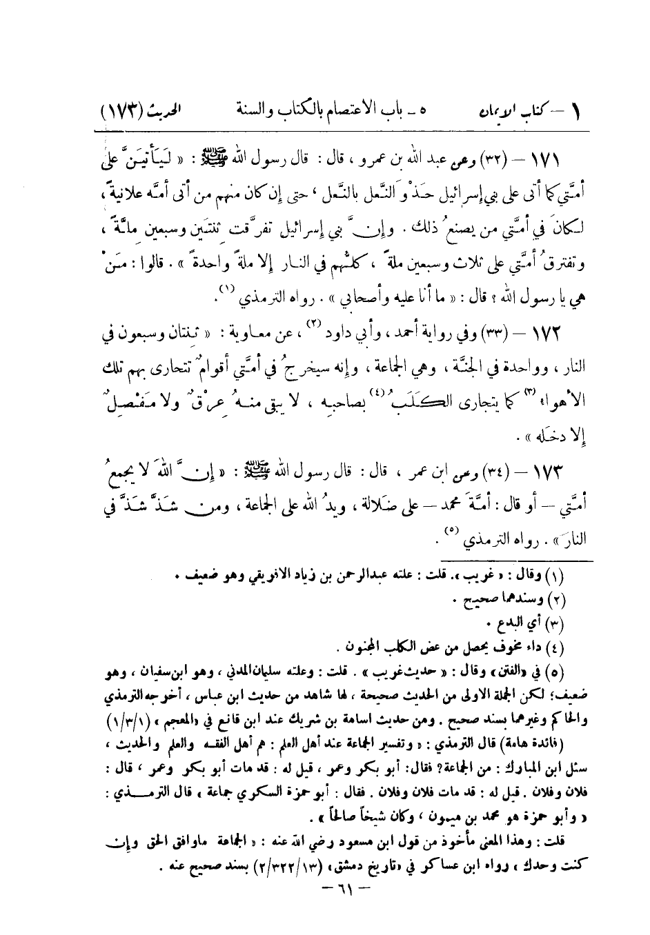 وَعَنْ عَبْدِ اللَّهِ بْنِ عَمْرٍو قَالَ قَالَ رَسُولُ اللَّهِ صَلَّى اللَّهُ عَلَيْهِ وَسَلَّمَ: «لَيَأْتِيَنَّ عَلَى أُمَّتِي مَا أَتَى عَلَى بَنِي إِسْرَائِيلَ حَذْوَ النَّعْلِ بِالنَّعْلِ حَتَّى إِنَّ كَانَ مِنْهُمْ مَنْ أَتَى أُمَّهُ عَلَانِيَةً لَكَانَ فِي أُمَّتِي مَنْ يَصْنَعُ ذَلِكَ وَإِنَّ بَنِي إِسْرَائِيلَ تَفَرَّقَتْ عَلَى ثِنْتَيْنِ وَسَبْعِينَ مِلَّةً وَتَفْتَرِقُ أُمَّتِي عَلَى ثَلَاثٍ وَسَبْعِينَ مِلَّةً كُلُّهُمْ فِي النَّارِ إِلَّا مِلَّةً وَاحِدَةً قَالُوا وَمن هِيَ يَا رَسُولَ اللَّهِ قَالَ مَا أَنَا عَلَيْهِ وأصحابي» . رَوَاهُ التِّرْمِذِيّ