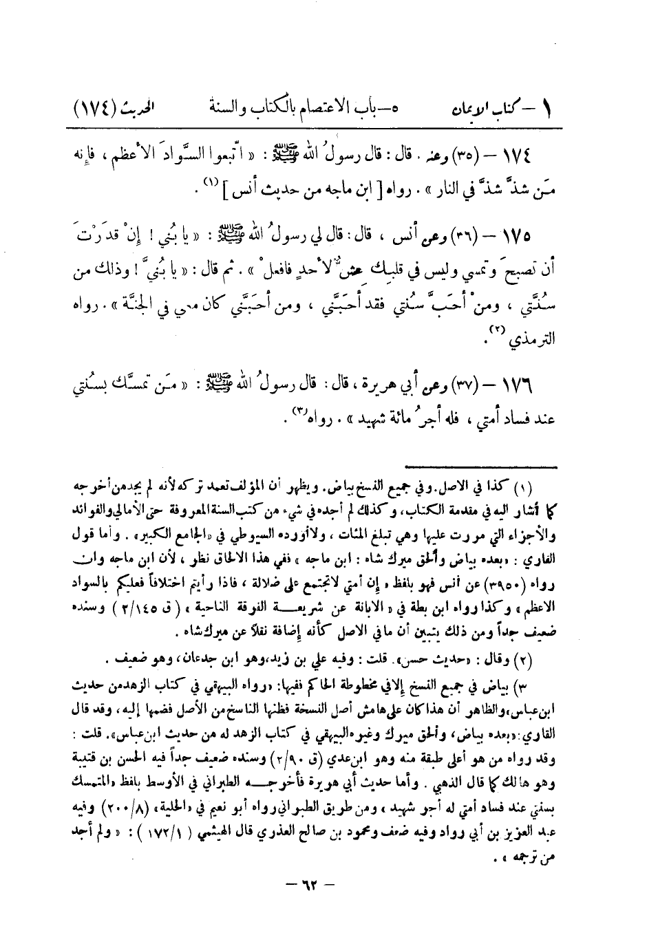 وَعَنْهُ قَالَ: قَالَ رَسُولُ اللَّهِ صَلَّى اللَّهُ عَلَيْهِ وَسَلَّمَ: «اتَّبِعُوا السَّوَادَ الْأَعْظَمَ فَإِنَّهُ مَنْ شَذَّ شَذَّ فِي النَّارِ» . رَوَاهُ ابْنُ مَاجَهْ من حَدِيث أنس