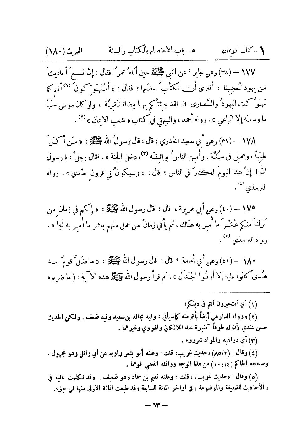 وَعَنْ أَبِي أُمَامَةَ قَالَ: قَالَ رَسُولُ اللَّهِ صَلَّى اللَّهُ عَلَيْهِ وَسَلَّمَ: «مَا ضَلَّ قَوْمٌ بَعْدَ هُدًى كَانُوا عَلَيْهِ إِلَّا أُوتُوا الْجَدَلَ» . ثُمَّ قَرَأَ رَسُولُ اللَّهِ صَلَّى اللَّهُ عَلَيْهِ وَسَلَّمَ هَذِهِ الْآيَةَ: (مَا ضَرَبُوهُ -[64]- لَكَ إِلَّا جدلا بل هم قوم خصمون)