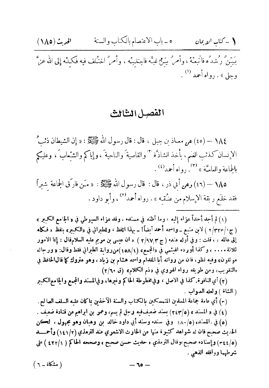عَنْ مُعَاذِ بْنِ جَبَلٍ قَالَ: قَالَ رَسُولُ اللَّهِ صَلَّى اللَّهُ عَلَيْهِ وَسَلَّمَ: «إِنَّ الشَّيْطَانَ ذِئْبُ الْإِنْسَانِ كَذِئْبِ الْغَنَمِ يَأْخُذُ الشَّاذَّةَ وَالْقَاصِيَةَ وَالنَّاحِيَةَ وَإِيَاكُمْ وَالشِّعَابَ وَعَلَيْكُمْ بِالْجَمَاعَةِ وَالْعَامَّةِ» . رَوَاهُ أَحْمد