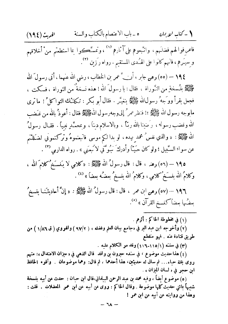 عَن جَابِرٍ: (أَنَّ عُمَرَ بْنَ الْخَطَّابِ رَضِيَ اللَّهُ عَنْهُمَا أَتَى رَسُولَ اللَّهِ صَلَّى اللَّهُ عَلَيْهِ وَسَلَّمَ بِنُسْخَةٍ مِنَ التَّوْرَاةِ فَقَالَ يَا رَسُولَ اللَّهِ هَذِهِ نُسْخَةٌ مِنَ التَّوْرَاةِ فَسَكَتَ فَجَعَلَ يقْرَأ وَوجه رَسُول الله يَتَغَيَّرُ فَقَالَ أَبُو بَكْرٍ ثَكِلَتْكَ الثَّوَاكِلُ مَا تَرَى مَا بِوَجْهِ رَسُولِ اللَّهِ صَلَّى اللَّهُ عَلَيْهِ وَسَلَّمَ فَنَظَرَ عُمَرُ إِلَى وَجْهِ رَسُولِ اللَّهِ صَلَّى اللَّهُ عَلَيْهِ وَسَلَّمَ فَقَالَ أَعُوذُ بِاللَّه من غضب الله وَغَضب رَسُوله صلى الله عَلَيْهِ وَسلم رَضِينَا بِاللَّهِ رَبًّا وَبِالْإِسْلَامِ دِينًا وَبِمُحَمَّدٍ نَبِيًّا فَقَالَ رَسُولُ اللَّهِ صَلَّى اللَّهُ عَلَيْهِ وَسَلَّمَ: " وَالَّذِي نَفْسُ مُحَمَّدٍ بِيَدِهِ لَوْ بَدَا لَكُمْ مُوسَى فَاتَّبَعْتُمُوهُ وَتَرَكْتُمُونِي لَضَلَلْتُمْ عَنْ سَوَاءِ السَّبِيلِ وَلَوْ كَانَ حَيًّا وَأَدْرَكَ نُبُوَّتِي لَاتَّبَعَنِي)