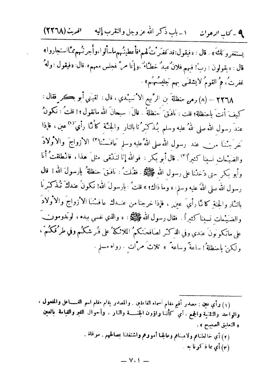 وَعَن حَنْظَلَة بن الرّبيع الأسيدي قَالَ: لَقِيَنِي أَبُو بكر فَقَالَ: كَيْفَ أَنْتَ يَا حَنْظَلَةُ؟ قُلْتُ: نَافَقَ حَنْظَلَةُ قَالَ: سُبْحَانَ اللَّهِ مَا تَقُولُ؟ قُلْتُ: نَكُونُ عِنْدَ رَسُولِ اللَّهِ صَلَّى اللَّهُ عَلَيْهِ وَسَلَّمَ يُذَكِّرُنَا بِالنَّارِ وَالْجَنَّةِ كَأَنَّا رَأْيُ عَيْنٍ فَإِذَا خَرَجْنَا مِنْ عِنْدَ رَسُولِ اللَّهِ صَلَّى اللَّهُ عَلَيْهِ وَسَلَّمَ عَافَسْنَا الْأَزْوَاجَ وَالْأَوْلَادَ وَالضَّيْعَاتِ نَسِينَا كثيرا قَالَ أَبُو بكر: فو الله إِنَّا لَنَلْقَى مِثْلَ هَذَا فَانْطَلَقْتُ أَنَا وَأَبُو بَكْرٍ حَتَّى دَخَلْنَا عَلَى رَسُولِ اللَّهِ صَلَّى اللَّهُ عَلَيْهِ وَسَلَّمَ فَقُلْتُ: نَافَقَ حَنْظَلَةُ يَا رَسُولَ اللَّهُ قَالَ رَسُولُ اللَّهِ صَلَّى اللَّهُ عَلَيْهِ وَسَلَّمَ: «وَمَا ذَاكَ؟» قُلْتُ: يَا رَسُولَ اللَّهِ نَكُونُ عِنْدَكَ تُذَكِّرُنَا بِالنَّارِ وَالْجَنَّةِ كَأَنَّا رَأْيَ عَيْنٍ فَإِذَا خَرَجْنَا مِنْ عِنْدِكَ عَافَسْنَا الْأَزْوَاجَ وَالْأَوْلَادَ وَالضَّيْعَاتِ نَسِينَا كَثِيرًا فَقَالَ رَسُولُ اللَّهِ صَلَّى اللَّهُ عَلَيْهِ وَسَلَّمَ: «الَّذِي نَفْسِي بِيَدِهِ لَوْ تَدُومُونَ عَلَى مَا تَكُونُونَ عِنْدِي وَفِي الذِّكْرِ لَصَافَحَتْكُمُ الْمَلَائِكَةُ عَلَى فُرُشِكُمْ وَفِي طُرُقِكُمْ وَلَكِنْ يَا حَنْظَلَةُ سَاعَةٌ وَسَاعَةٌ» ثَلَاث مَرَّات. رَوَاهُ مُسلم