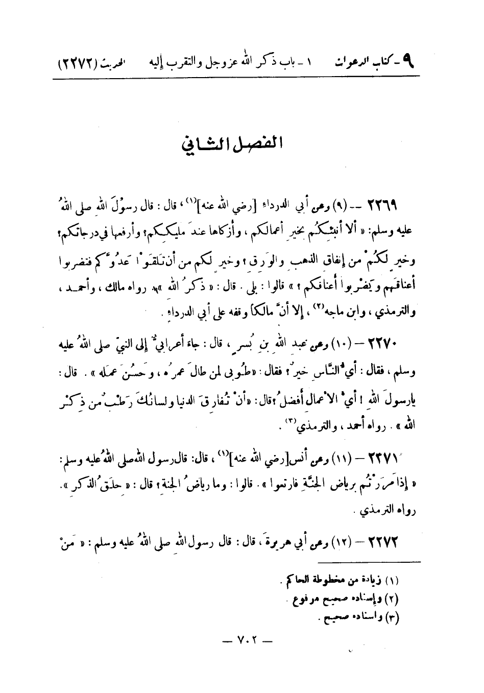 وَعَنْ أَبِي الدَّرْدَاءِ رَضِيَ اللَّهُ عَنْهُ قَالَ: قَالَ رَسُولُ اللَّهِ صَلَّى اللَّهُ عَلَيْهِ وَسَلَّمَ: «أَلَا أُنَبِّئُكُمْ بِخَيْرِ أَعْمَالِكُمْ وَأَزْكَاهَا عِنْدَ مَلِيكِكُمْ؟ وَأَرْفَعِهَا فِي دَرَجَاتِكُمْ؟ وَخَيْرٍ لَكُمْ مِنْ إِنْفَاقِ الذهبِ والوَرِقِ؟ وخيرٍ لكم مِنْ أَنْ تَلْقَوْا عَدُوَّكُمْ فَتَضْرِبُوا أَعْنَاقَهُمْ وَيَضْرِبُوا أَعْنَاقَكُمْ؟» قَالُوا: بَلَى قَالَ: «ذِكْرُ اللَّهِ» . رَوَاهُ مَالِكٌ وَأَحْمَدُ وَالتِّرْمِذِيُّ وَابْنُ مَاجَهْ إِلَّا أَنَّ مَالِكًا وَقفه على أبي الدَّرْدَاء