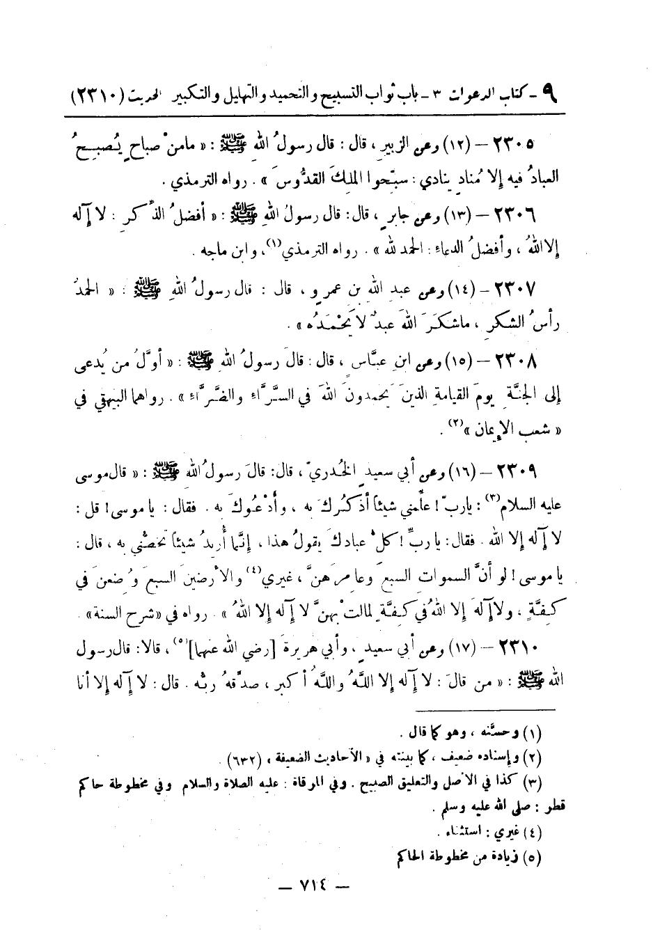 وَعَنْ أَبِي سَعِيدٍ الْخُدْرِيِّ قَالَ: قَالَ رَسُولُ اللَّهِ صَلَّى اللَّهُ عَلَيْهِ وَسَلَّمَ: " قَالَ مُوسَى عَلَيْهِ السَّلَامُ: يَا رَبِّ عَلِّمْنِي شَيْئًا أَذْكُرُكَ بِهِ وَأَدْعُوكَ بِهِ فَقَالَ: يَا مُوسَى قُلْ: لَا إِلَهَ إِلَّا اللَّهُ فَقَالَ: يَا رَبِّ كلُّ عبادكَ يقولُ هَذَا إِنَّما أيد شَيْئًا تَخُصُّنِي بِهِ قَالَ: يَا مُوسَى لَوْ أَنَّ السَّمَاوَاتِ السَّبْعَ وَعَامِرَهُنَّ غَيْرِي وَالْأَرَضِينَ السَّبْعَ وُضِعْنَ فِي كِفَّةٍ وَلَا إِلَهَ إِلَّا اللَّهُ فِي كِفَّةٍ لَمَالَتْ بِهِنَّ لَا إِلَهَ إِلَّا اللَّهُ ". رَوَاهُ فِي شرح السّنة