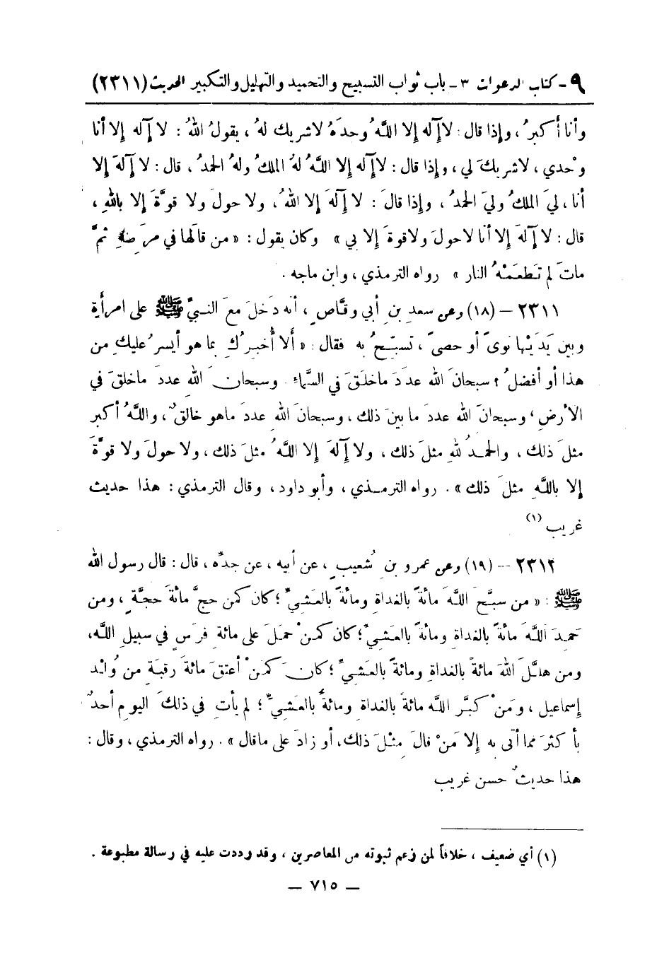 وَعَنْ عَمْرِو بْنِ شُعَيْبٍ عَنْ أَبِيهِ عَنْ جَدِّهِ قَالَ: قَالَ رَسُولُ اللَّهِ صَلَّى اللَّهُ عَلَيْهِ وَسَلَّمَ: " مَنْ سَبَّحَ اللَّهَ مِائَةً بِالْغَدَاةِ وَمِائَةً بِالْعَشِيِّ كَانَ كَمَنْ حَجَّ مِائَةَ حَجَّةٍ وَمَنْ حَمِدَ اللَّهَ مِائَةً بِالْغَدَاةِ وَمِائَةً بِالْعَشِيِّ كَانَ كَمَنْ حَمَلَ عَلَى مِائَةِ فَرَسٍ فِي سَبِيلِ اللَّهِ وَمَنْ هَلَّلَ اللَّهَ مِائَةً بِالْغَدَاةِ وَمِائَةً بِالْعَشِيِّ كَانَ كَمَنْ أَعْتَقَ مِائَةَ رَقَبَةٍ مِنْ وَلَدِ إِسْمَاعِيلَ وَمَنْ كَبَّرَ اللَّهَ مِائَةً بِالْغَدَاةِ وَمِائَةً بِالْعَشِيِّ لَمْ يَأْتِ فِي ذَلِكَ الْيَوْمِ أَحَدٌ بِأَكْثَرِ مِمَّا أَتَى بِهِ إِلَّا مَنْ قَالَ مِثْلَ ذَلِكَ أَوْ زَادَ عَلَى مَا قَالَ. رَوَاهُ التِّرْمِذِيُّ. وَقَالَ: هَذَا حَدِيثٌ غَرِيب