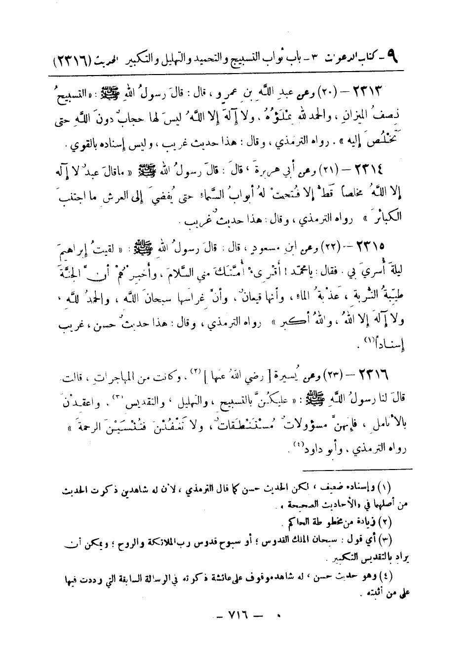 وَعَنْ عَبْدِ اللَّهِ بْنِ عَمْرٍو قَالَ: قَالَ رَسُولُ اللَّهِ صَلَّى اللَّهُ عَلَيْهِ وَسَلَّمَ: «التَّسْبِيحُ نِصْفُ الْمِيزَانِ وَالْحَمْدُ لِلَّهِ يَمْلَؤُهُ وَلَا إِلَهَ إِلَّا اللَّهُ لَيْسَ لَهَا حِجَابٌ دُونَ اللَّهِ حَتَّى تَخْلُصَ إِلَيْهِ» . رَوَاهُ التِّرْمِذِيُّ. وَقَالَ: هَذَا حَدِيثٌ غَرِيبٌ وَلَيْسَ إِسْنَاده بِالْقَوِيّ