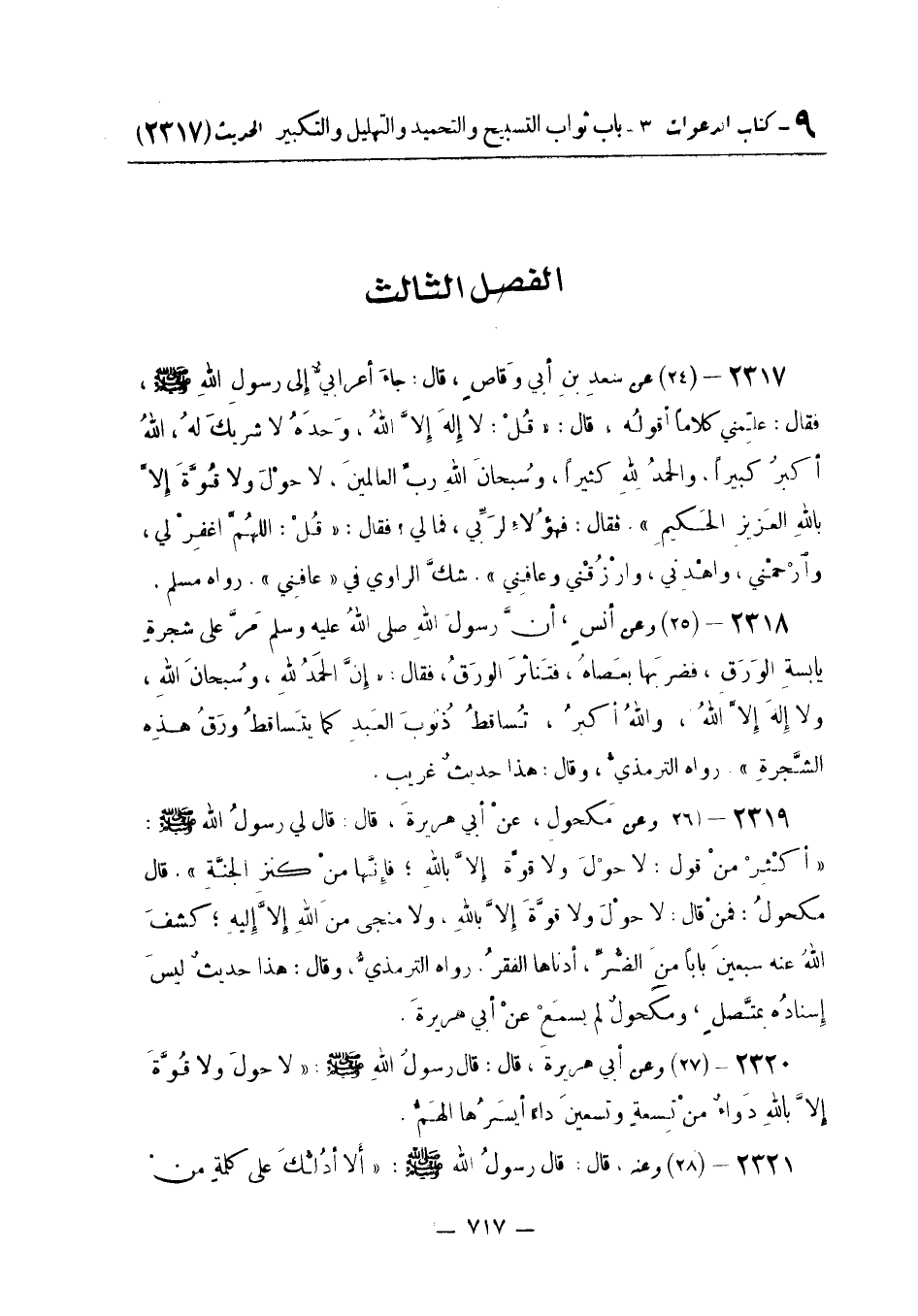 وَعَن مَكحولِ عَنْ أَبِي هُرَيْرَةَ قَالَ: قَالَ رَسُولُ اللَّهِ صَلَّى اللَّهُ عَلَيْهِ وَسَلَّمَ: " أَكْثِرْ مِنْ قَوْلِ: لَا حَوْلَ وَلَا قُوَّةَ إِلَّا بِاللَّهِ فَإِنَّهَا مِنْ كَنْزِ الْجَنَّةِ ". قَالَ مَكْحُولٌ: فَمَنْ قَالَ: لَا حَوْلَ وَلَا قُوَّةَ إِلَّا بِاللَّهِ وَلَا مَنْجًى مِنَ اللَّهِ إِلَّا إِلَيْهِ كَشَفَ اللَّهُ عَنْهُ سَبْعِينَ بَابًا مِنَ الضُّرِّ أَدْنَاهَا الْفَقْرُ. رَوَاهُ التِّرْمِذِيُّ. وَقَالَ: هَذَا حَدِيثٌ لَيْسَ إِسْنَادُهُ بِمُتَّصِلٍ وَمَكْحُولٌ لَمْ يَسْمَعْ عَنْ أَبِي هُرَيْرَةَ